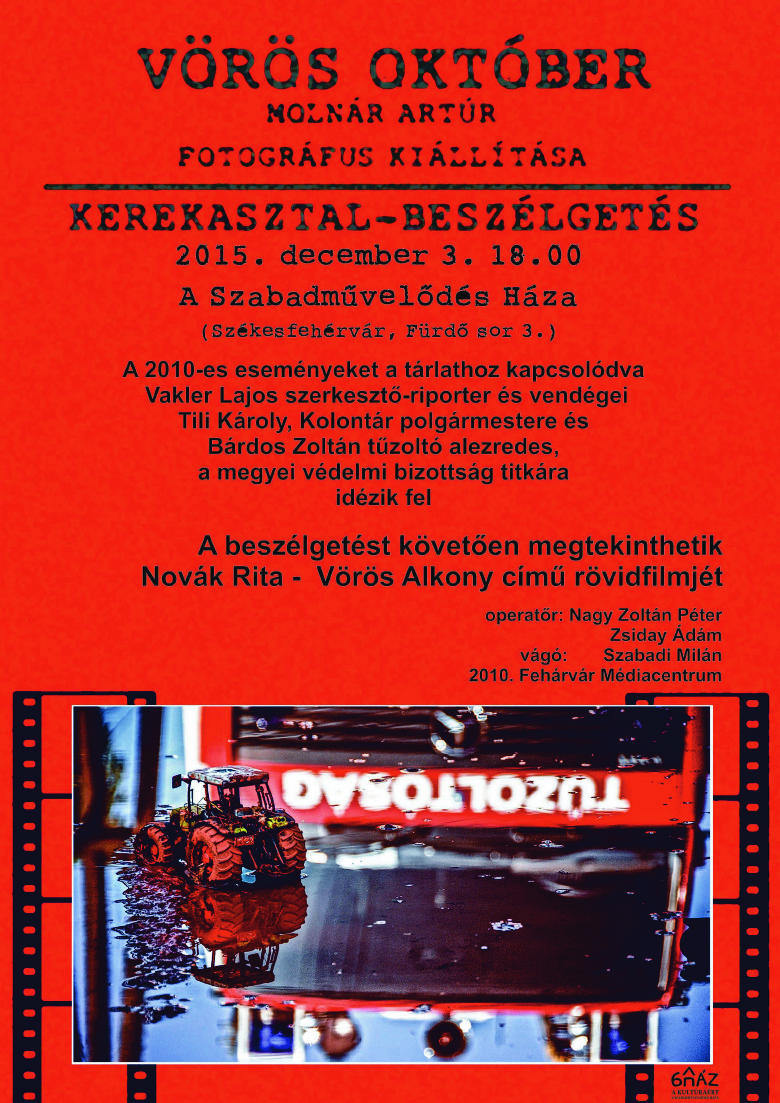 December 3-án, csütörtökön Molnár Artúr Vörös október című kiállításához kapcsolódóan kerekasztal- beszélgetést szerveznek A Szabadművelődés Házában. Vakler Lajos vendége lesz Tili Károly, Kolontár polgármestere és Bárdos Zoltán tűzoltó alezredes, a megyei védelmi bizottság titkára. A beszélgetést követően levetítik Novák Rita Vörös alkony című rövidfilmjét is.