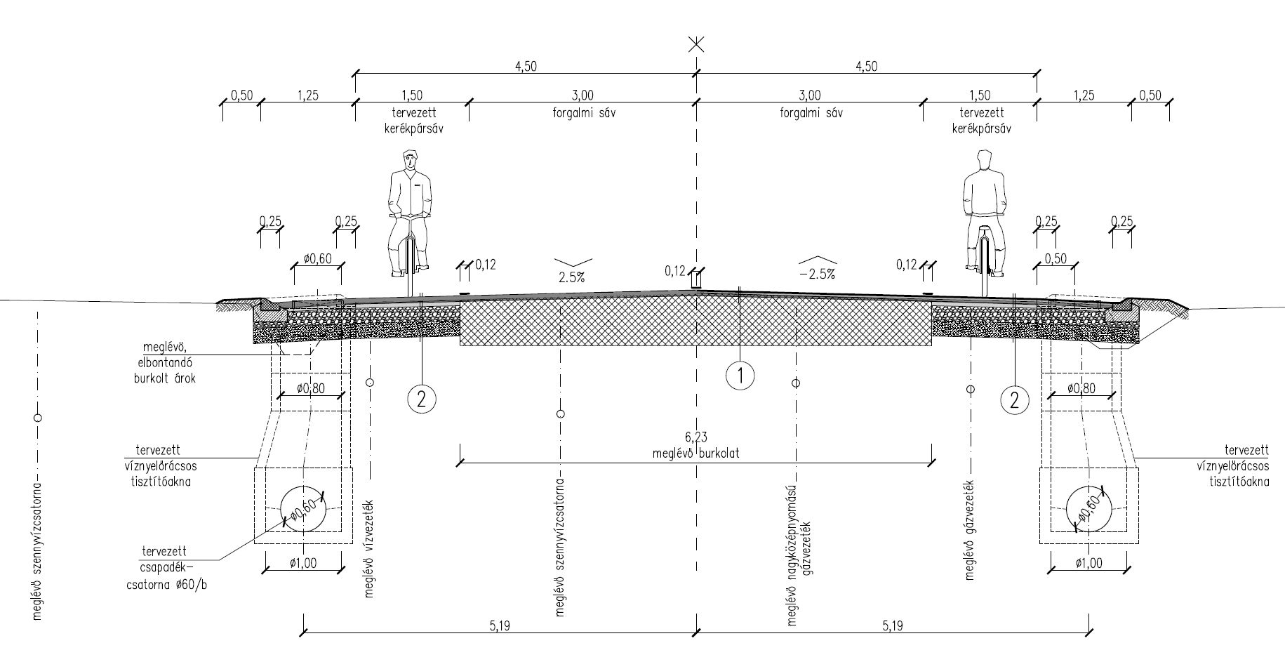 Az útpálya forgalmi sávonként három-három méter széles marad, mellette az utca mindkét oldalán másfél-másfél méter széles kerékpársávokat építenek. Ehhez több helyen a jelenlegi nyílt csapadékvízelvezető árkokat a föld alá kell süllyeszteni. A kerékpársávok szélei szegélyezettek lesznek és víznyelők biztosítják majd az út szélén a csapadékvíz elfolyását.
