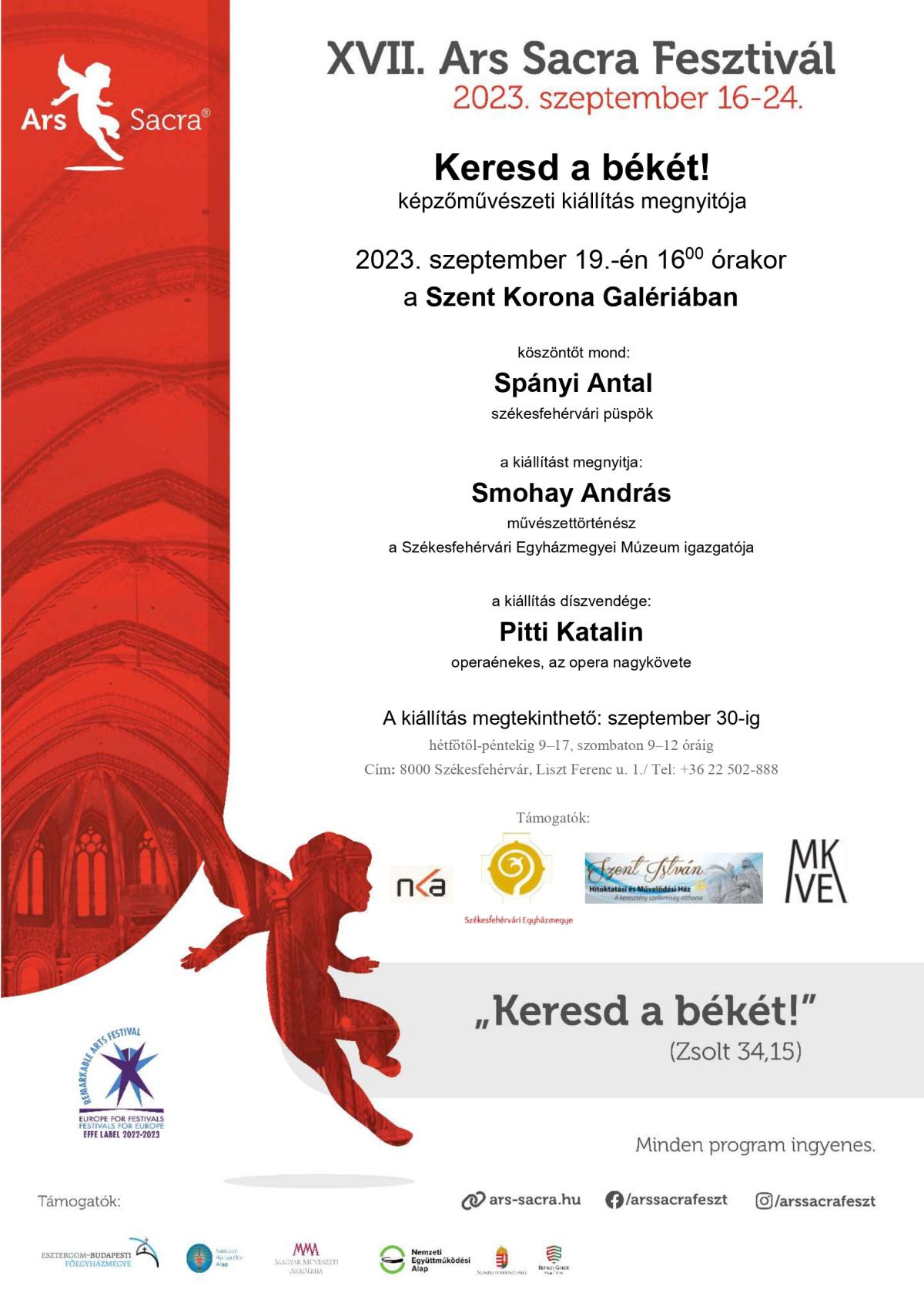 Szeptember 19-én kedden 16 órakor az Ars Sacra Fesztivál keretében nyílik meg a Keresd a békét! képzőművészeti kiállítás. A tárlatnyitón köszöntőt mond Spányi Antal székesfehérvári püspök, a kiállítást Smohay András művészettörténész, a Székesfehérvári Egyházmegyei Múzeum igazgatója nyitja meg. A kiállítás díszvendége: Pitti Katalin Liszt-díjas operaénekes.