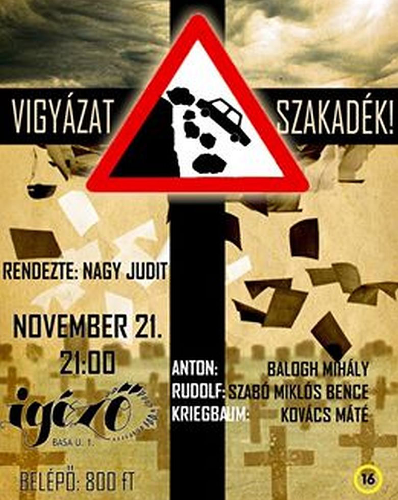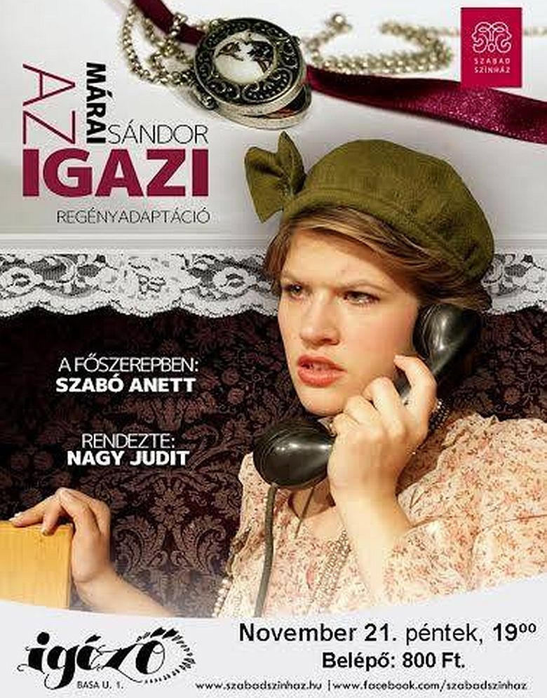 November 21-én, pénteken este az Igézőben (Székesfehérvár, Basa u. 1.) két előadást is megtekinthetnek az érdeklődők. Előbb Nagy Judit rendezésében Márai Sándor: Az igazi című darabot játsszák 19 órától, majd ezt követően Tankred Dorst: Vigyázat szakadék című tragikomédiáját lehet megnézni 21 órától. Jegyek mindkét előadásra elővételben, az Igéző pénztárában kaphatók 800 Forintos áron.