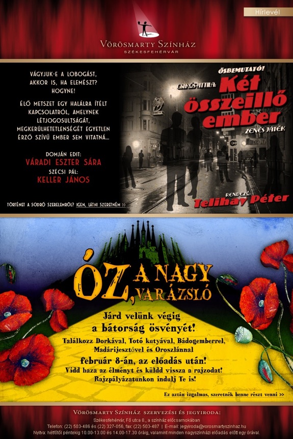 Újabb ősbemutatót láthat a fehérvári közönség. Csikós Attila darabját, a Két összeillő embert február 3-án mutatják be a Pelikán Kamaraszínházban. Jegyek korlátozott számban kaphatók a premierre. A darab Domján Edit és Szécsi Pál legendás szerelemi történetét dolgozza fel, amely tragédiával végződött: mindketten önkezükkel vetettek véget életüknek. Az előadás rendezője Telihay Péter, a két főszereplőt Váradi Eszter Sára és Keller János alakítja.