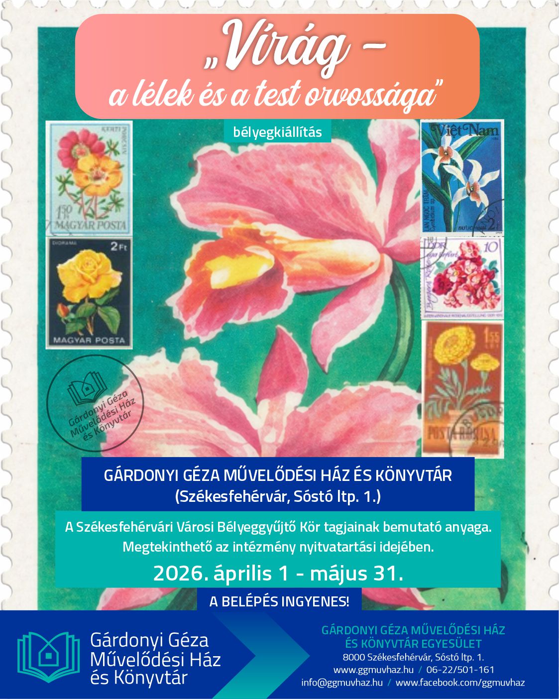 Ugyancsak a napokban nyílt meg az intézményben a „Virág – a lélek és a test orvossága” című bélyegkiállítás, amely a természet szépségét és jelképiségét mutatja be. A Székesfehérvári Városi Bélyeggyűjtő Kör válogatásában a virágmotívumok esztétikai és kulturális jelentése egyaránt megjelenik. A kiállítás 2026. április 1. és május 31. között látogatható, a belépés díjtalan.