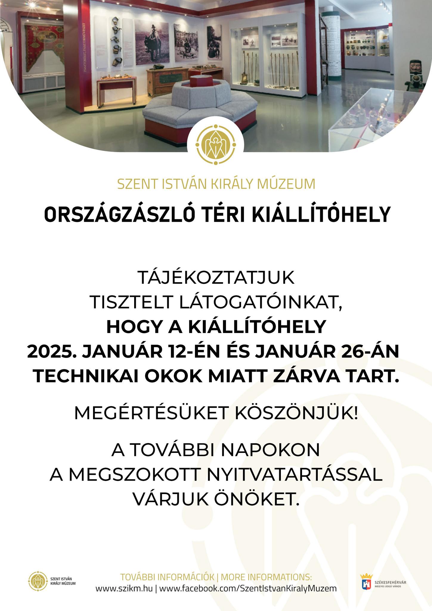 A Szent István Király Múzeum a közösségi oldalán adta hírül, hogy technikai okok miatt nem nyit ki az Országzászló téri kiállítóhely két vasárnapon, január 12-én és január 26-án.