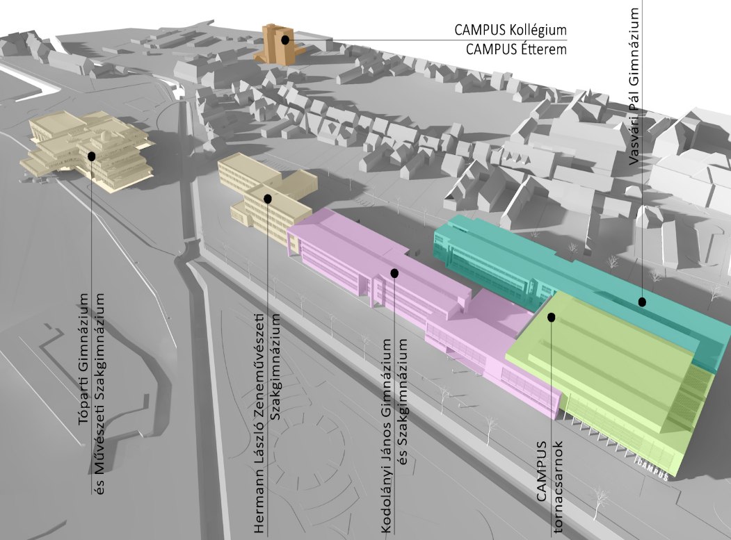 Mészáros Attila, Székesfehérvár alpolgármestere a campus kialakításának részleteiről szólva elmondta, hogy a campusban új épületet kap a Vasvári Pál Gimnázium egy 24 osztályos épületegyüttessel. A Kodolányi Középiskola jelenlegi épületéből a tornacsarnok és az első blokk átalakításokkal megmarad, míg a régi műhelyszárny bontásra kerül. A főiskola épületéhez legközelebbi épületet is elbontják. A Kodolányi János Középiskola is 24 osztályos intézmény lesz, ahol a sporttal kapcsolatos tevékenységeket bővítik. Az új campusba költözik a Hermann László Zeneművészeti Szakgimnázium és Alapfokú Művészeti Iskola is, épületében egy hangverseny termet is kialakítanak. A Tóparti Gimnáziummal kapcsolatban Mészáros Attila elmondta, hogy a gimnázium jelenlegi „megosztottsága” megszűnik, cél hogy egy épületbe hozzák valamennyi osztályt. A Szabadművelődés Házában a 2. és 3. szint oktatási célokat szolgál majd, közösségi célokra a földszintet és a negyedik szintet használhatják. Szintén a campus része lesz a Sörház téri kollégium épülete, amelyet felújítanak, szintenként 6 darab négyágyas szoba kap helyet külön vizesblokkokkal. A kollégium étterme is megújul és egy 600 adagos konyha lesz.