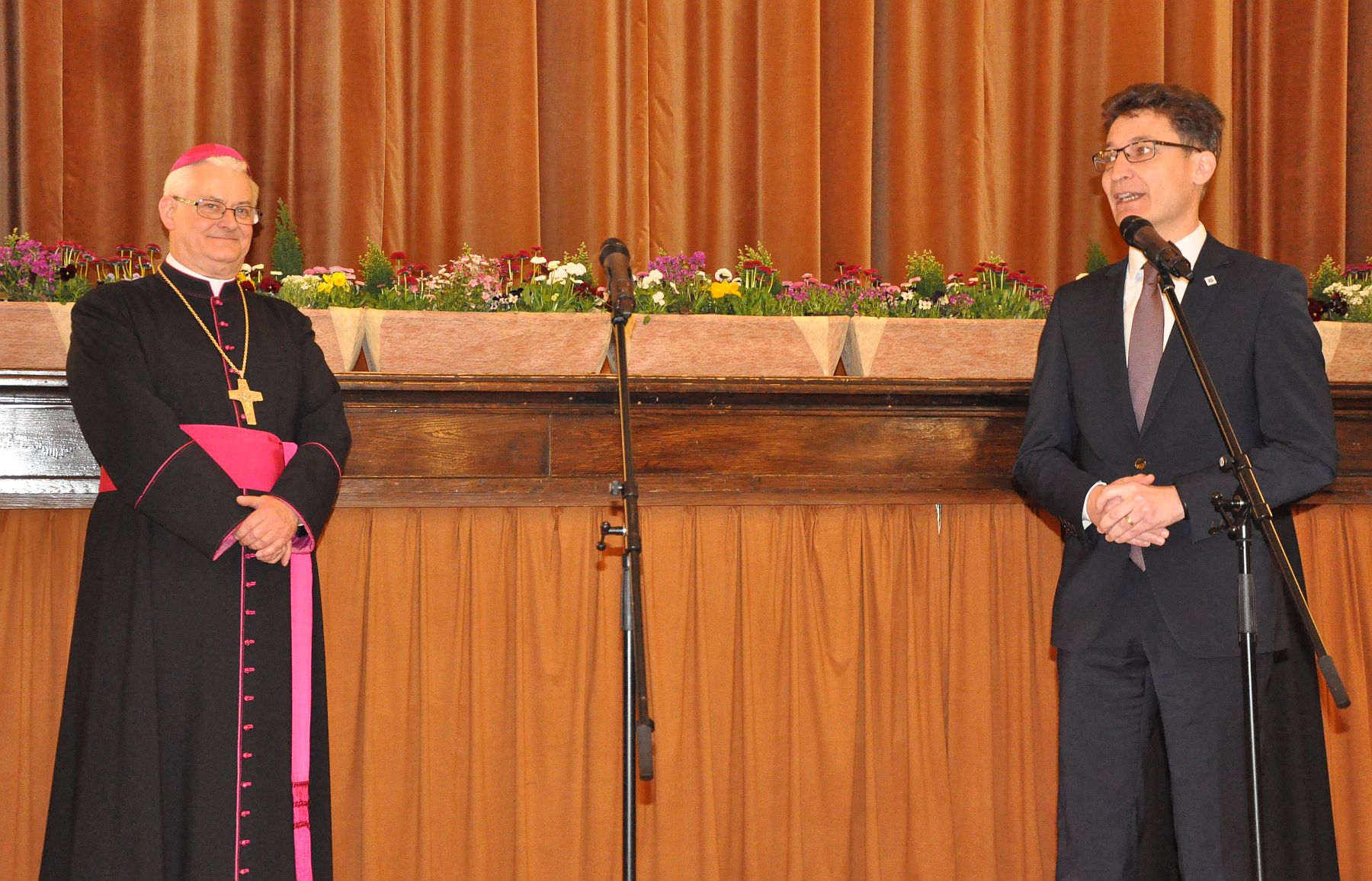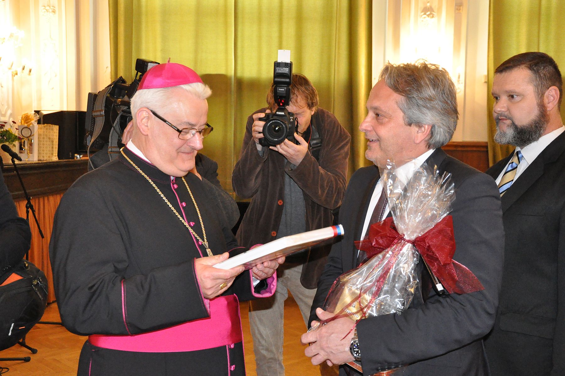 Dr. Cser-Palkovics András a saját, valamit elődje, Warvasovszky Tihamér, polgármester nevében is megköszönte az elmúlt 15 esztendő együttműködését, egyházmegye és önkormányzat, püspök és polgármesterek között. Elmondta, hogy Antal püspök atya az első pillanattól kezdve partner abban, hogy az egyházmegye és székvárosa, Székesfehérvár nagy történelmi adósságát - amely sokféle ok miatt halmozódott fel - törlessze. Lépésenként, - mert egyszerre több száz év adósságát nem lehet ledolgozni, - de folyamatosan. Ezt a munkát az egyház nélkül nem hogy nem lehetséges véghezvinni, hanem egészen bizonyos, hogy elhivatott püspök nélkül esélye sem lenne a városnak. „Köszönöm a történelemszemléletet, mely nem csak értékeinkről és hagyományainkról, hanem jelenünkről és jövendőnkről is szól.” - hangsúlyozta ünnepi köszöntőjében Székesfehérvár polgármestere.