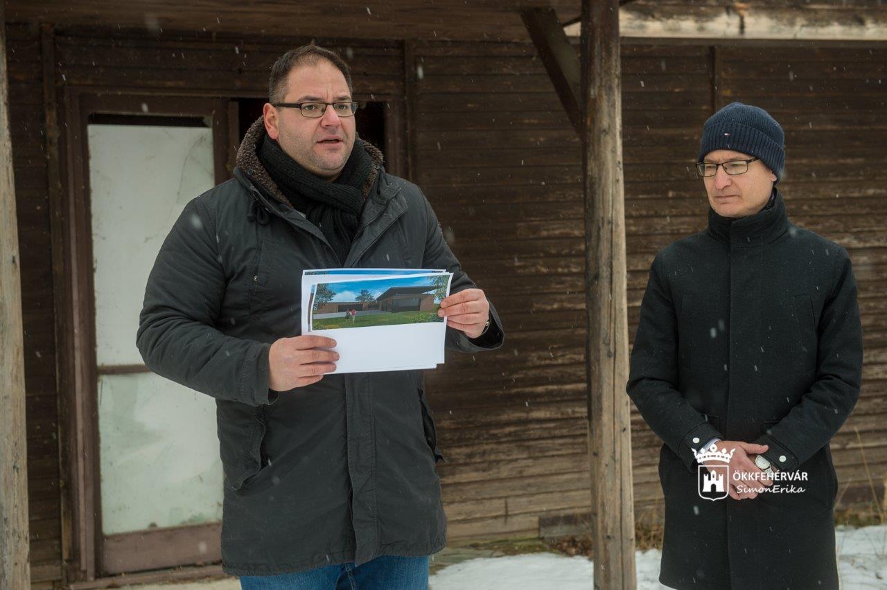 Cser-Palkovics András polgármester, Mészáros Attila alpolgármester és Csete Gábor a Városgondnokság természetvédelmi referense a beruházást ismertetó sajtótájékoztatón. Elhangzott, hogy a területen található régi épület összes felhasználható anyagából a Városgondnokság asztalosműhelye előtt egy fedett tárolót építenek.