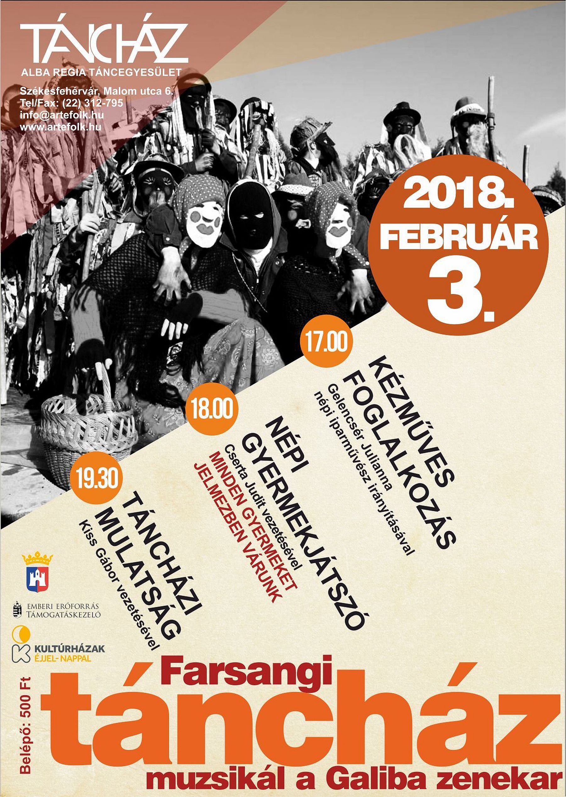 Az Alba Regia Táncegyesület farsangi családi programja szombaton 17 órakor kézműves foglalkozással kezdődik a Malom utcai Táncházban, ahol farsangi maszkokat lehet készíteni Gelencsér Julianna népi iparművész irányításával. Cserta Judit vezeti a 18 órakor kezdődő táncos gyermekjátszót, ahova minden gyermeket jelmezben várnak. 19:30 órától indul a táncházi mulatság, a lépéseket Kiss Gábor mutatja. Egész este a Galiba zenekar muzsikál, a belépődíj 500 forint. Mindkét program része a Kultúrházak éjjel-nappal rendezvénysorozatnak.