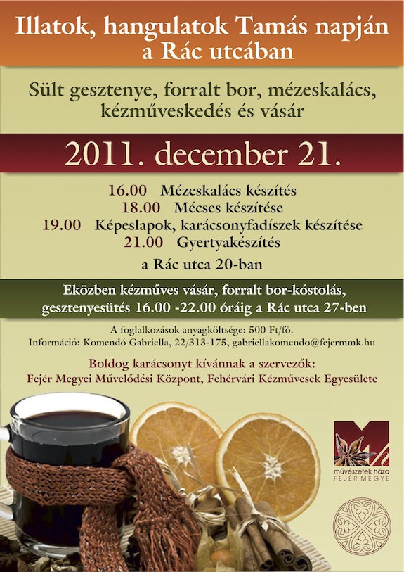 December 21-én, Tamás napján, a csillagászati tél első napján a fehérvári kézművesek jó hangulattal, sült gesztenyével és forralt borral várják a látogatókat a Rác utca kézműves alkotóházaiba 16.00 és 22.00 óra között. A hangulatos program során készíthetnek a vendégek gyertyát, téli finomságokat, például hájas tésztát, süteményeket, és mézeskalácsot, illetve kézműves ritkaságokat is beszerezhetnek az érdeklődők a fa alá.