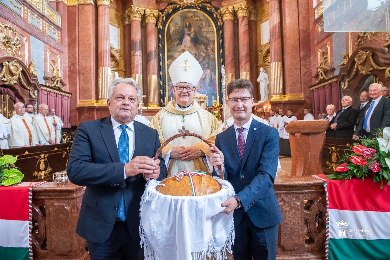 A szentmise végén a hagyományt követve a megyéspüspök megáldotta az új kenyeret, az életnek és a keresztény magyar életünk szent szimbólumát, és Isten áldását kérte mindannyiunk kenyerére, családjainkra, nemzetünkre. Az új kenyeret Cser-Palkovics András polgármesternek és Vargha Tamás országgyűlési képviselőnek adta át, rajtuk keresztül pedig minden székesfehérvári polgárnak. Az ünnepi szentmise a Himnusz eléneklésével zárult a Székesegyházban.
