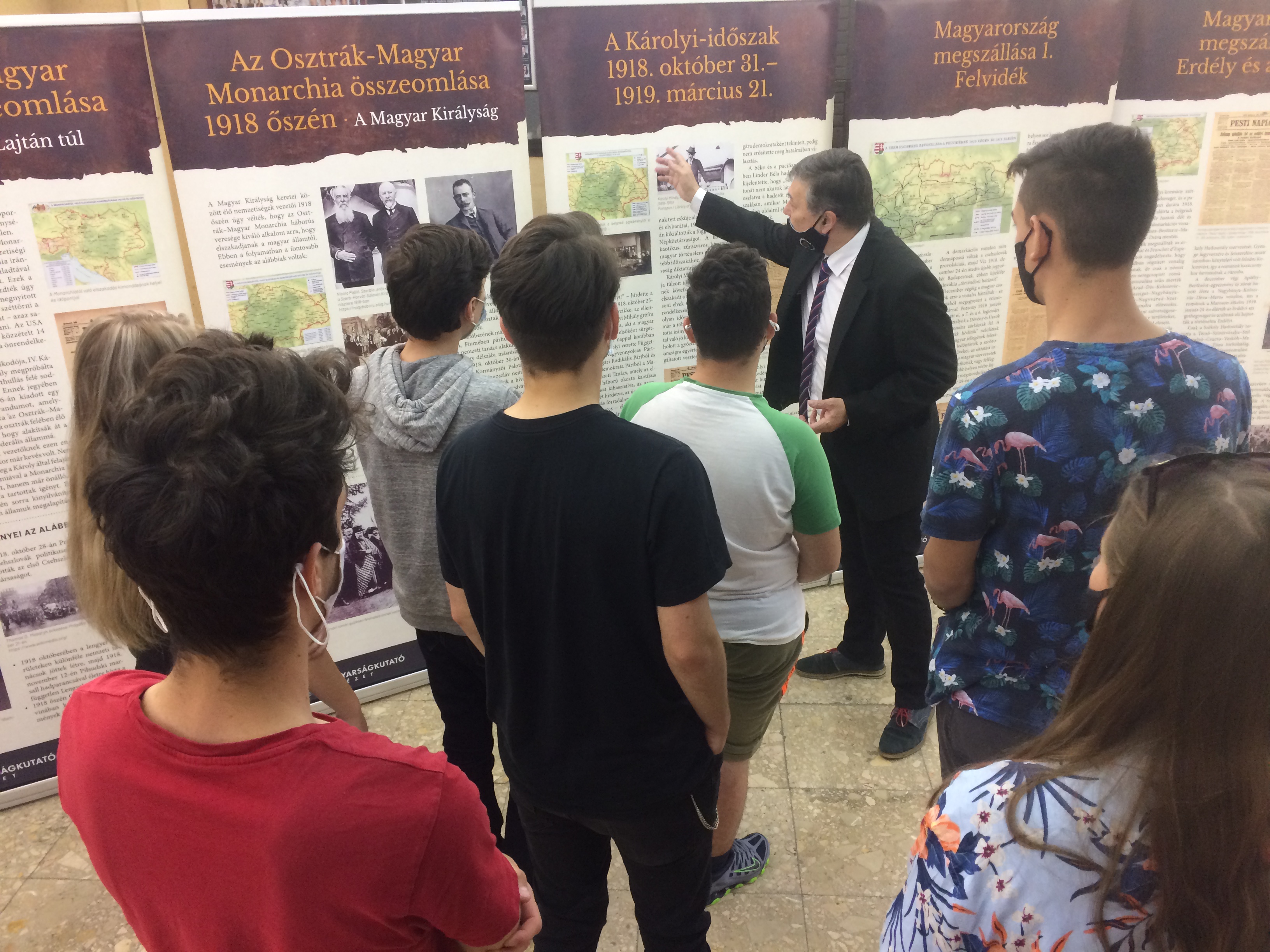 A Tóparti földszinti aulájában a nemzeti összetartozás napja tiszteletére kiállított tartalmas, képekkel is illusztrált anyagot Dr. Vizi László Tamás, a Magyarságkutató Intézet tudományos főigazgató-helyettese rögtönzött történelemóra keretében mutatta be az érdeklődő diákoknak.