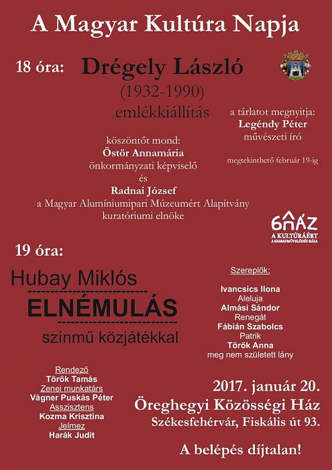 Kiállítással és színielőadással készül a Magyar Kultúra Napjára az Öreghegyi Közösségi Ház. 2017. január 20-án, pénteken 18.00 órakor nyitják meg Drégely László emlékkiállítását. A pécsi születésű festő- és szobrászművész, díszlettervező már befutott alkotóként kezdett el foglalkozni az alumíniummal, melyet alapanyagként használt fel a festészetben. Erős szálak kötötték Székesfehérvárhoz, ahol több kiállítása is volt, illetve az alumínium nyersanyagot is a városban szerezte be. Gyűjteményét a Zombori úti Magyar Alumíniumipari Múzeumra hagyományozta. Az itt őrzött alkotásokból, festményekből, szobrokból, kiadványokból és kéziratokból láthatnak válogatást az érdeklődők a pénteken nyíló kiállításon. Az eseményen köszöntőt mond Östör Annamária önkormányzati képviselő és Radnai József, a Magyar Alumíniumipari Múzeumért Alapítvány kuratóriumi elnöke. A tárlatot Legéndy Péter művészeti író ajánlja az érdeklődők figyelmébe.