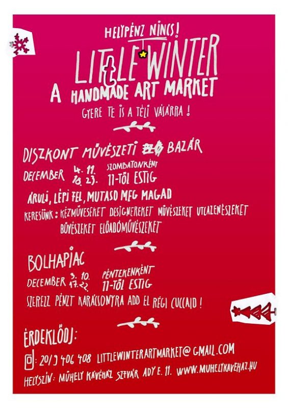 December 3. és 23. között várják az érdeklődőket Székesfehérváron, a Műhely Kávéház belső kertjében, ugyanis idén először rendezik meg a rendhagyó karácsonyi vásár, a Little Winter Art Market. A kezdeményezés Juhász Tibor festőművésztől és feleségétől származik, lényege pedig, hogy bemutatkozási lehetőséget nyújtson a fiatal művészeknek és designereknek, úgy, hogy mindemellett a hagyományos kézműves termékeket is megtalálja a vásárló - ráadásul mindezt minél olcsóbban.