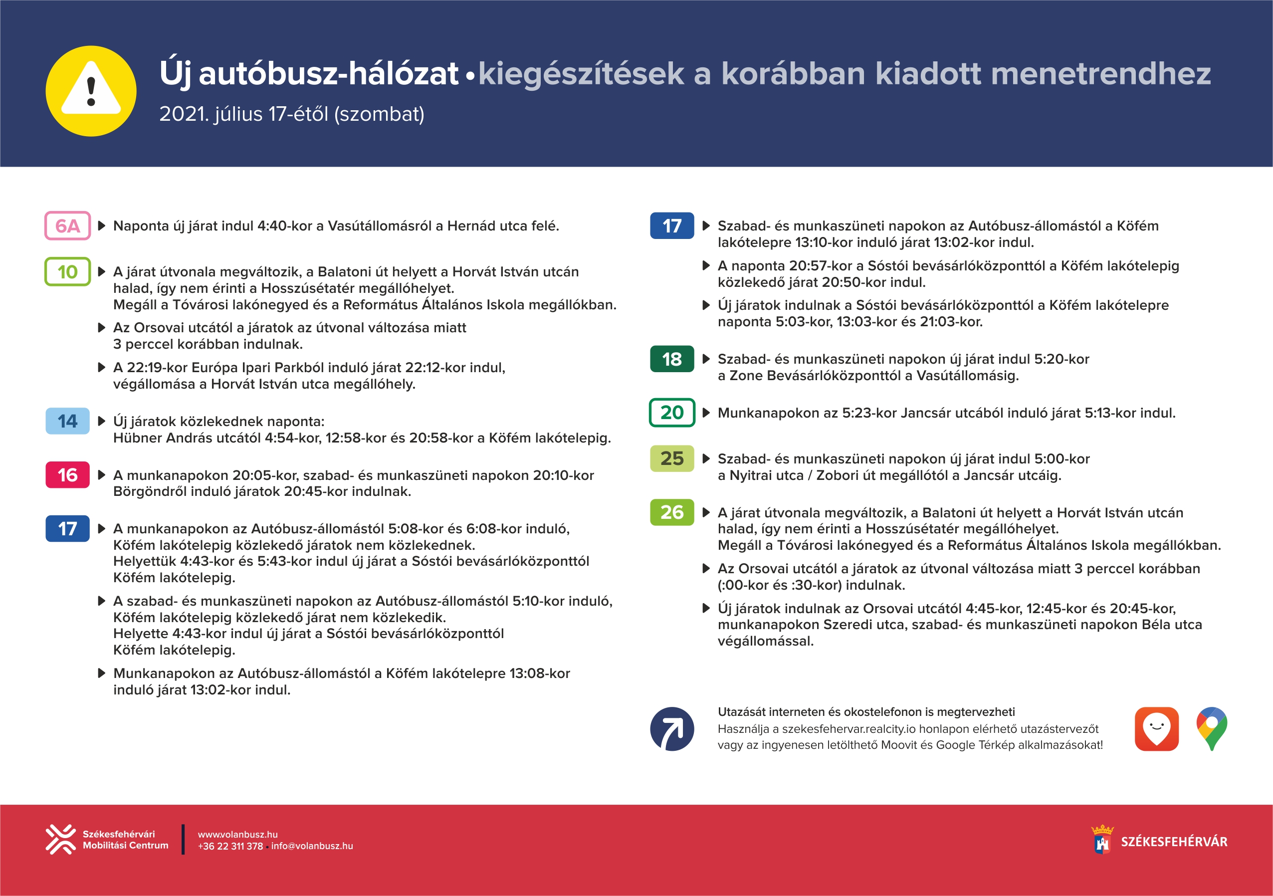 Az új buszhálózat és menetrend 2021. július 17-én lép életbe. A bevezetés első két hetében, 2021. július 16-tól egészen 2021. július 31-ig ingyenes lesz a közösségi közlekedés Székesfehérváron.