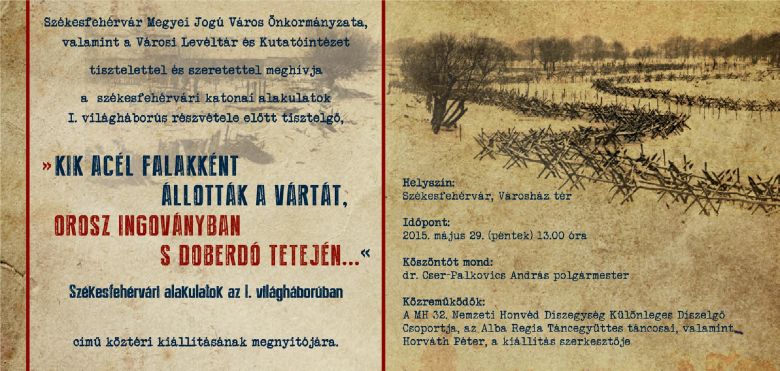 "Kik acél falakként állották a vártát - orosz ingoványban, s Doberdo tetején" címmel az első világháborúban harcoló székesfehérvári alakulatokkal foglalkozó tárlat nyílik a Városház téren május 29-én 13 órakor. A köztéri kiállításon Székesfehérvár polgármestere köszönti a megjelenteket, majd fellépnek az Alba Regia Táncegyüttes táncosai is.