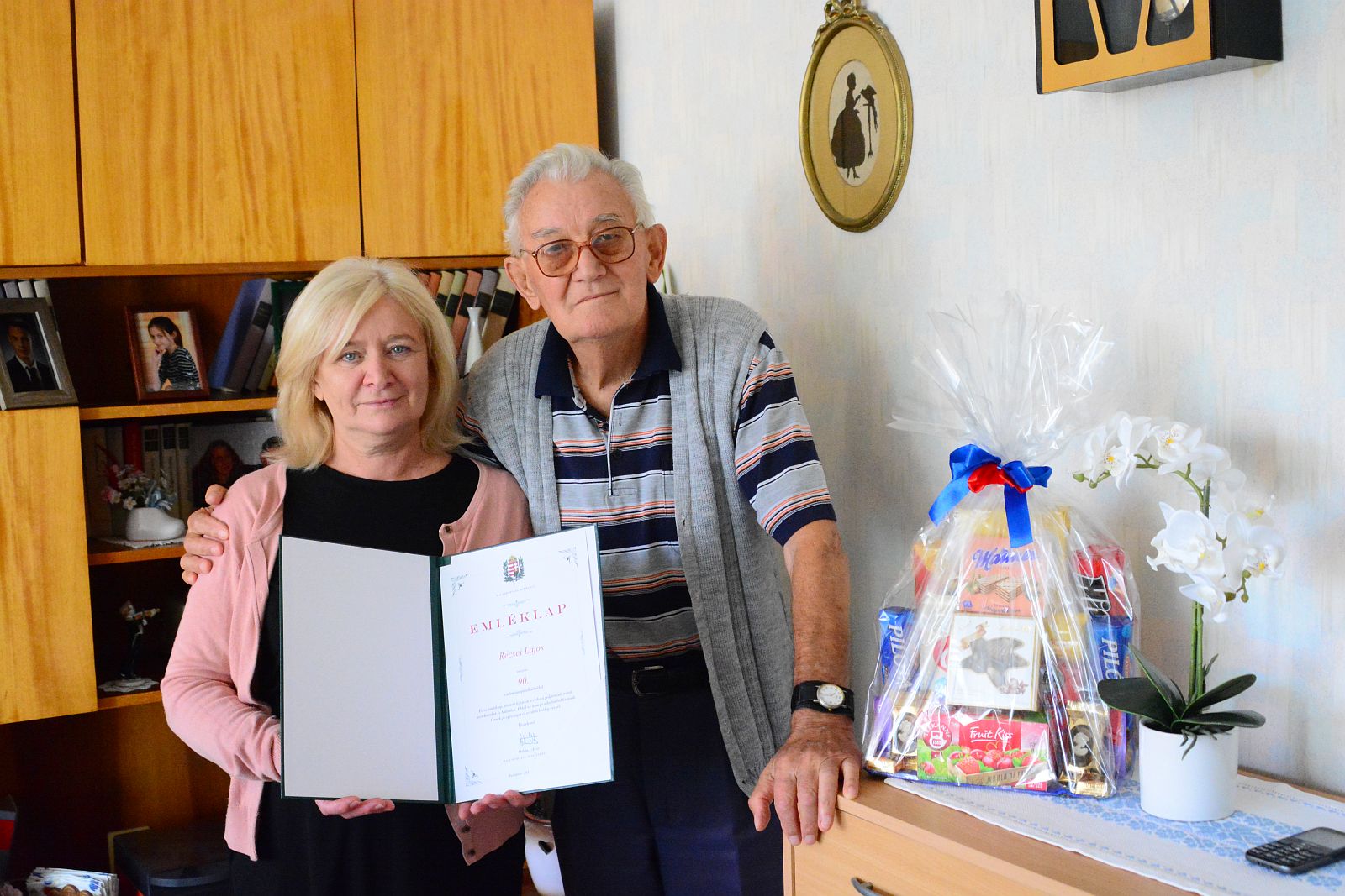 45 lépcső vezet a tiszta, rendezett lépcsőházban a lakásig – ezt napjában többször is megteszi Récsei Lajos, aki már a lépcsőházban várta délelőtt Brájer Évát. Maroshegy önkormányzati képviselője a város nevében egy szép ajándékkosarat, valamint egy Magyarország Miniszterelnöke által aláírt emléklapot is átadott az ünnepeltnek.