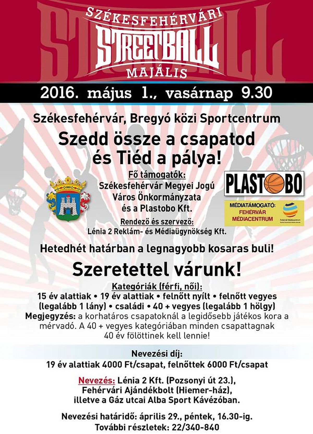 A május 1-jei utcai Kosárlabda Fesztivál a ’90-es évek elejétől kezdve szervesen hozzátartozott a város állandó tömegsportprogramjaihoz. 2012-ben egy sokéves hagyomány éledt újjá, Székesfehérvár Önkormányzatának támogatásával, valamint a Lénia 2 Kft. szervezésében. A kosárlabdát kedvelők legnagyobb örömére idén május 1-jén ismét együtt pattogtathatják a labdát a Bregyó Sportcentrumban. Az eseményre már most lehet nevezni, a szervezők jövő péntekig várják a csapatok jelentkezését. A Streetball Majálison iskolások, felnőttek, családi és vegyescsapatok versenyezhetnek.