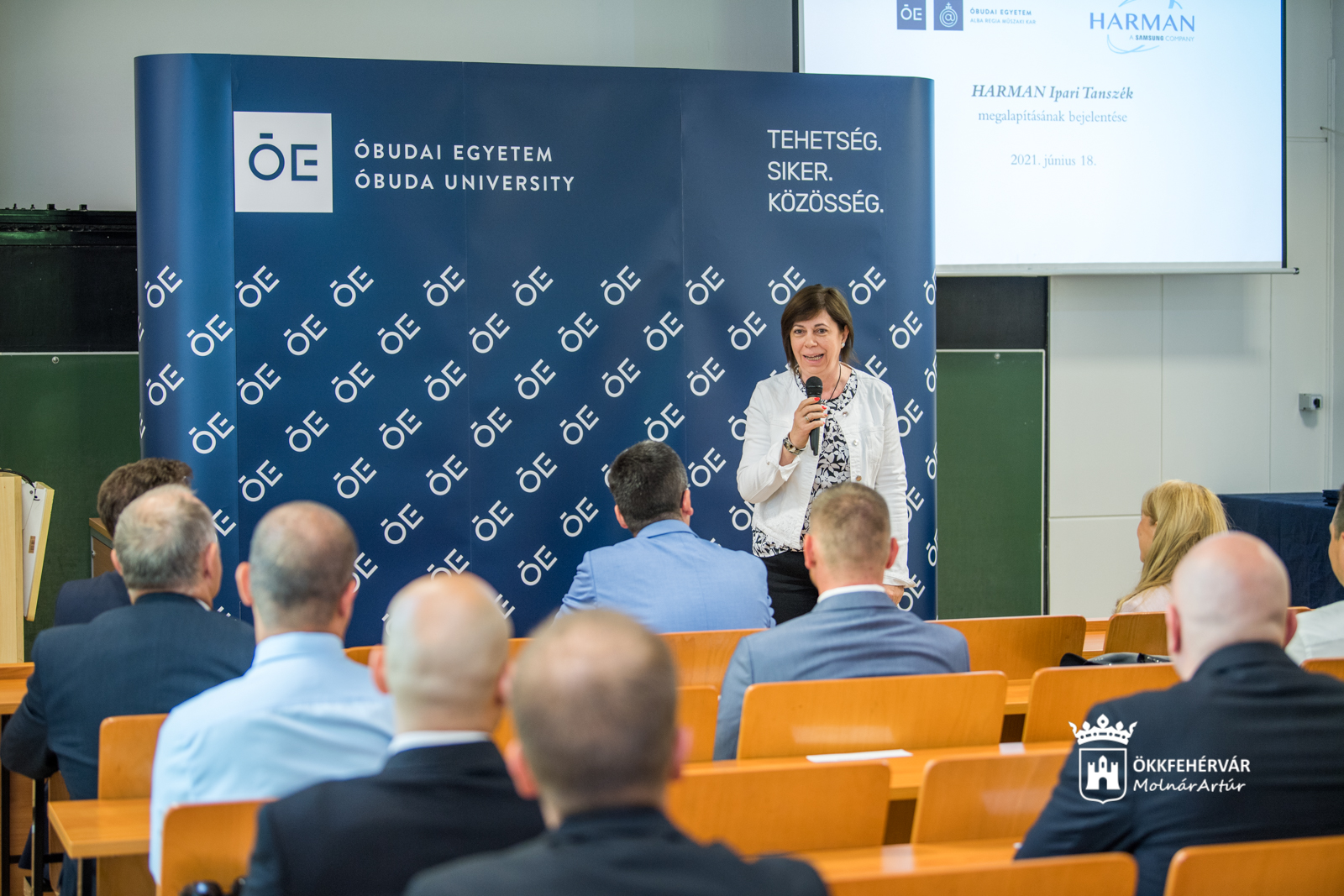 Preiszlerné Schweighardt Erzsébet, a Harman Magyarország Pénzügyekért felelős igazgatója, cégvezető, felidézte, hogy öt évvel ezelőtt, amikor elkezdték az együttműködést az egyetemmel a duális képzés kapcsán, már akkor arra gondoltak, hogy az együttműködés ki fog teljesedni. "Ez most valósult meg az ipari tanszék létrehozásával, hiszen a jövő nemzedékét neveljük ki és nagyon fontos a technikai és technológiai fejlődés kapcsán az is, hogy a vállalat mindig up to date megoldásokat nyújtson. Az Óbudai egyetem az utánpótlás kinevelésében kulcsfontosságú szerepe van" - tette hozzá.