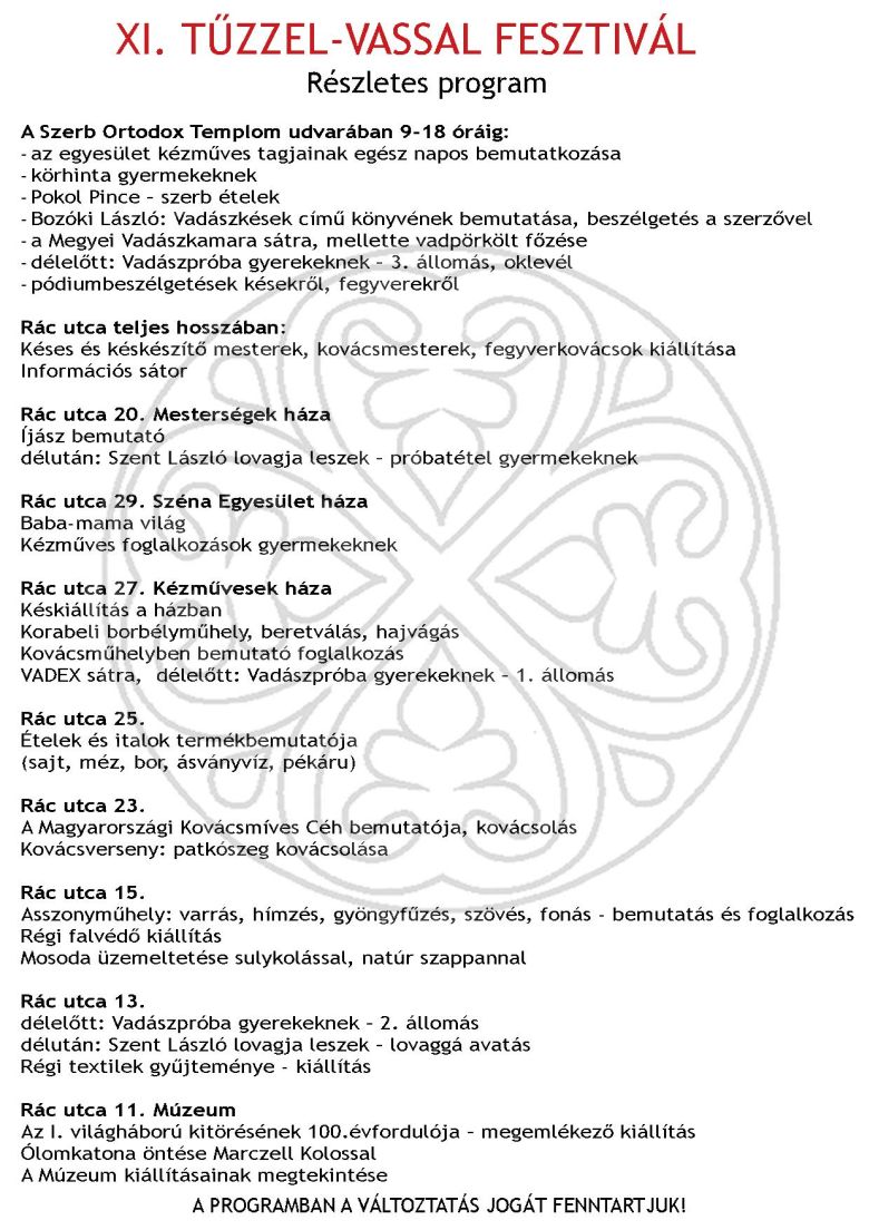 Idén már tizenegyedik alkalommal rendezik meg a Tűzzel-Vassal Fesztivált június 21-én. A rendezvénynek az idei évben is a skanzen ad otthont, ahol kovácsbemutatók, míves bicskák, tőrök, borbélyműhely, gyermekjátszók várják az érdeklődőket és kinyílnak a Rác utcai házak kapui is. Ezen a napon a Szerb Ortodox Templom is fogadja majd a látogatókat.