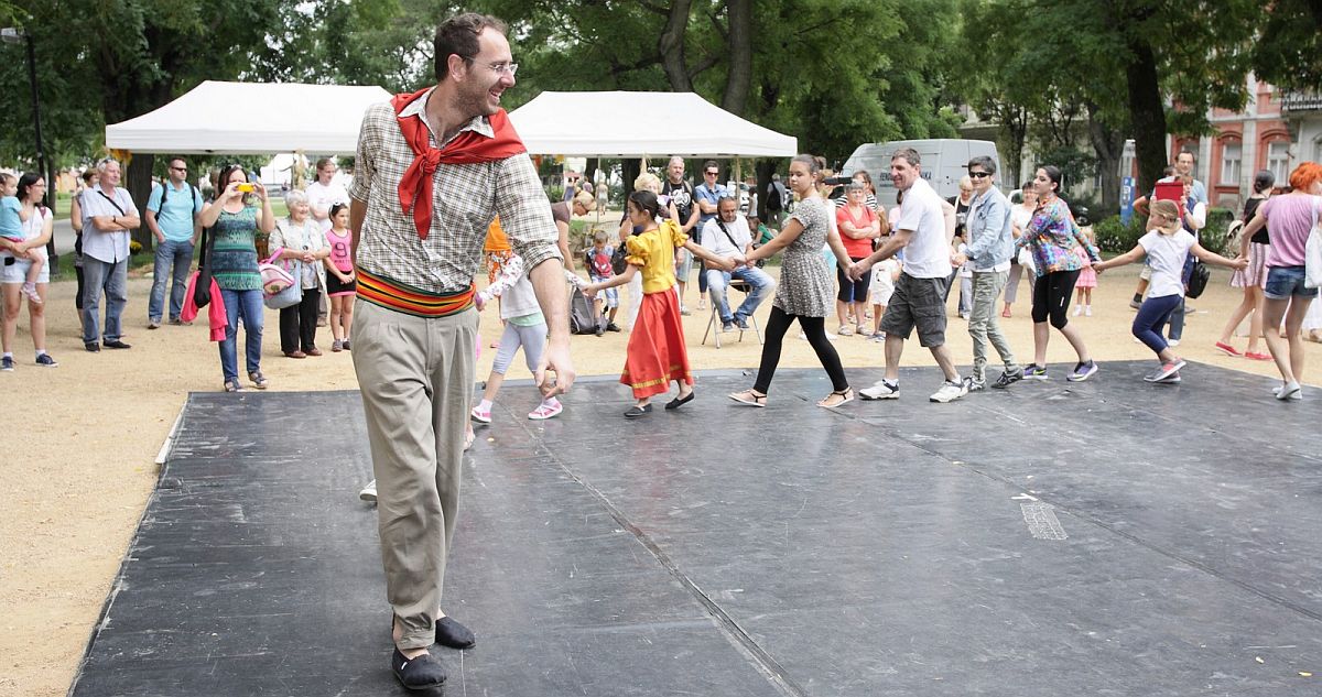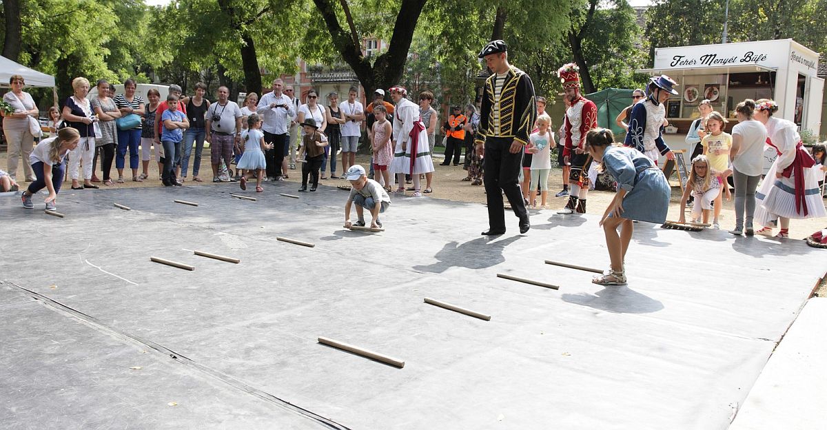 A délután folyamán a Zichy ligetben lévő Zenepavilon előtt Argentína, Baszkföld és Szlovákia együttesei várták a kicsiket a Királyi gyermekjátszóban. Elsőként kendővel a kezükben az argentinok idéztek meg táncaikkal karneváli hangulatot, majd körtáncra invitálták a jelenlévőket. Hangulatos kis versenyre is rávették a kislányokat és a kisfiúkat, akiknek egy kifeszített kötélen függő karikákba kellett szívószálat beleszúrniuk úgy, hogy közben egy felnőtt hátán lovagoltak. Az argentin vendégek édességgel és matricákkal köszönték meg a gyerekek érdeklődését.