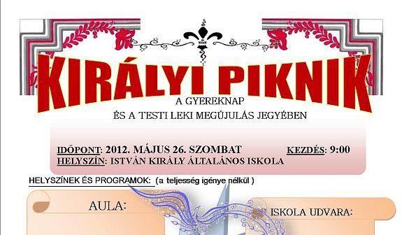 Az István Király Általános Iskola ismét megrendezi hagyományos programját, a királyi vigasságokat, amely idén a „Királyi Piknik” címet kapta. Május 26-án, szombaton 9.00 órától a gyermeknap és a testi-lelki megújulás jegyében zajlanak az események, rengeteg program várja az érdeklődőket. Lesz véradás és számos egészségügyi mérés és ismét megrendezik a panelkutya szépségversenyt.
