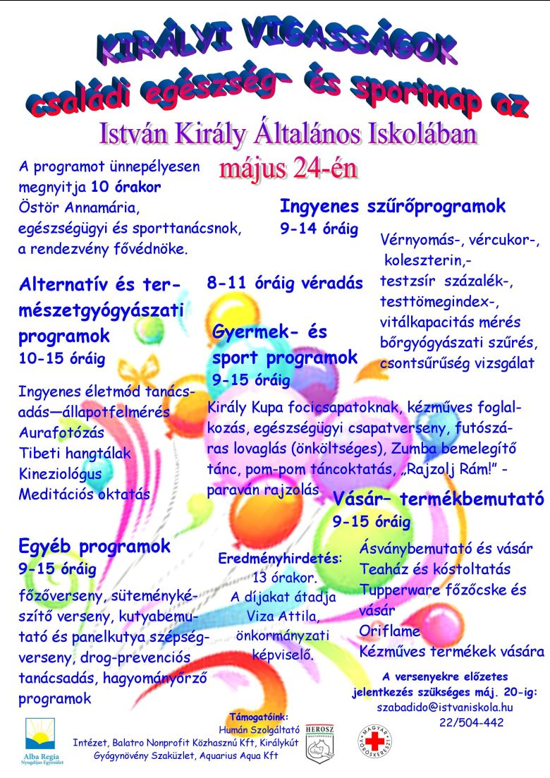 Ötödik alkalommal rendezi meg május 24-én, a „Királyi Vigasságok” című, népszerű egészség- és sportnapját az István Király Általános Iskola. A hagyományos rendezvény nem csak a palotavárosi iskola tanulóinak és családjaiknak, hanem az egész lakóközösségnek szól, a kínálatban helyet kap a sport, az alternatív- és természetgyógyászat, az életmódbeli tanácsadás, számos ingyenes szűrővizsgálat és véradás is.