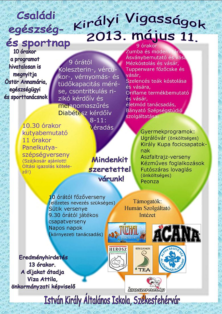 Az István Király Általános Iskola május 11-én ismét családi egészség- és sportnapra hívja a fehérváriakat. A vállalkozó kedvűek fakanalat ragadhatnak és benevezhetnek a főzőversenybe, de a konyhatündérek a sütik versenyén is összemérhetik tudásukat.