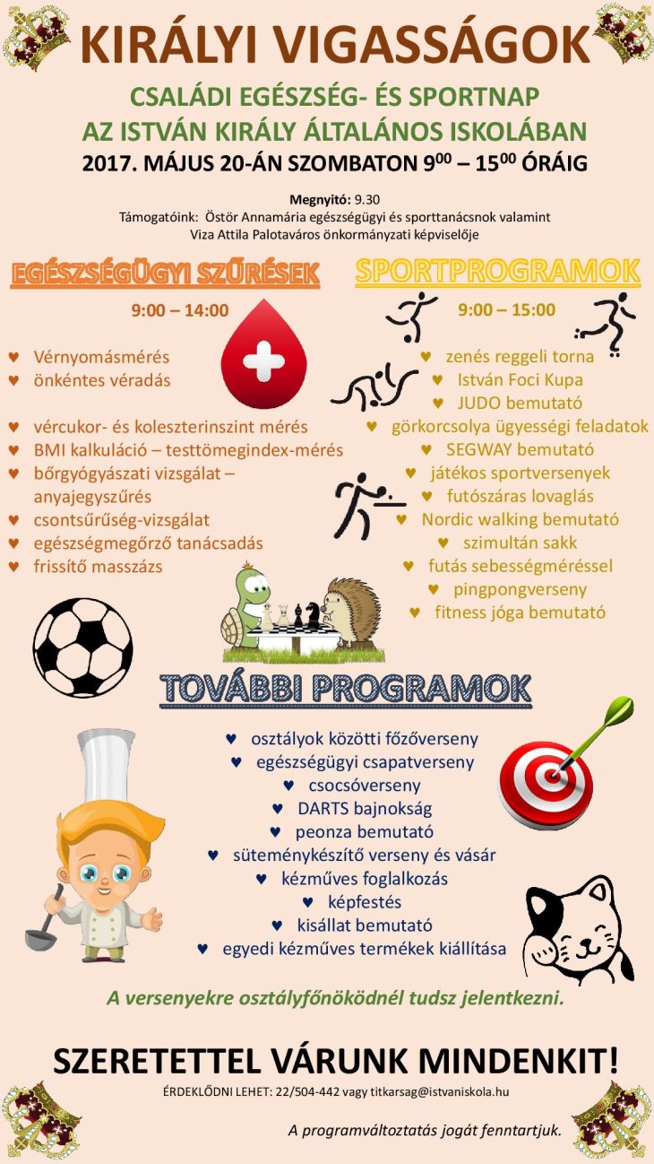 Az István Király Általános Iskola egyik legnépszerűbb rendezvénye a Királyi Vigasságok családi egészség- és sportnap, melyet idén május 20-án, szombaton 9 és 15 óra között rendeznek meg. Nemcsak a tanulókat, a pedagógusokat és családjaikat, de minden kedves érdeklődőt szeretettel várnak az egész napos kavalkádra.