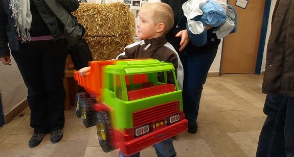 Szukován Adrián, a Tóvárosi óvoda középső csoportosa dömperét ajánlotta fel. A játékot saját maga rakta fel az adományokat szállító teherautóra.