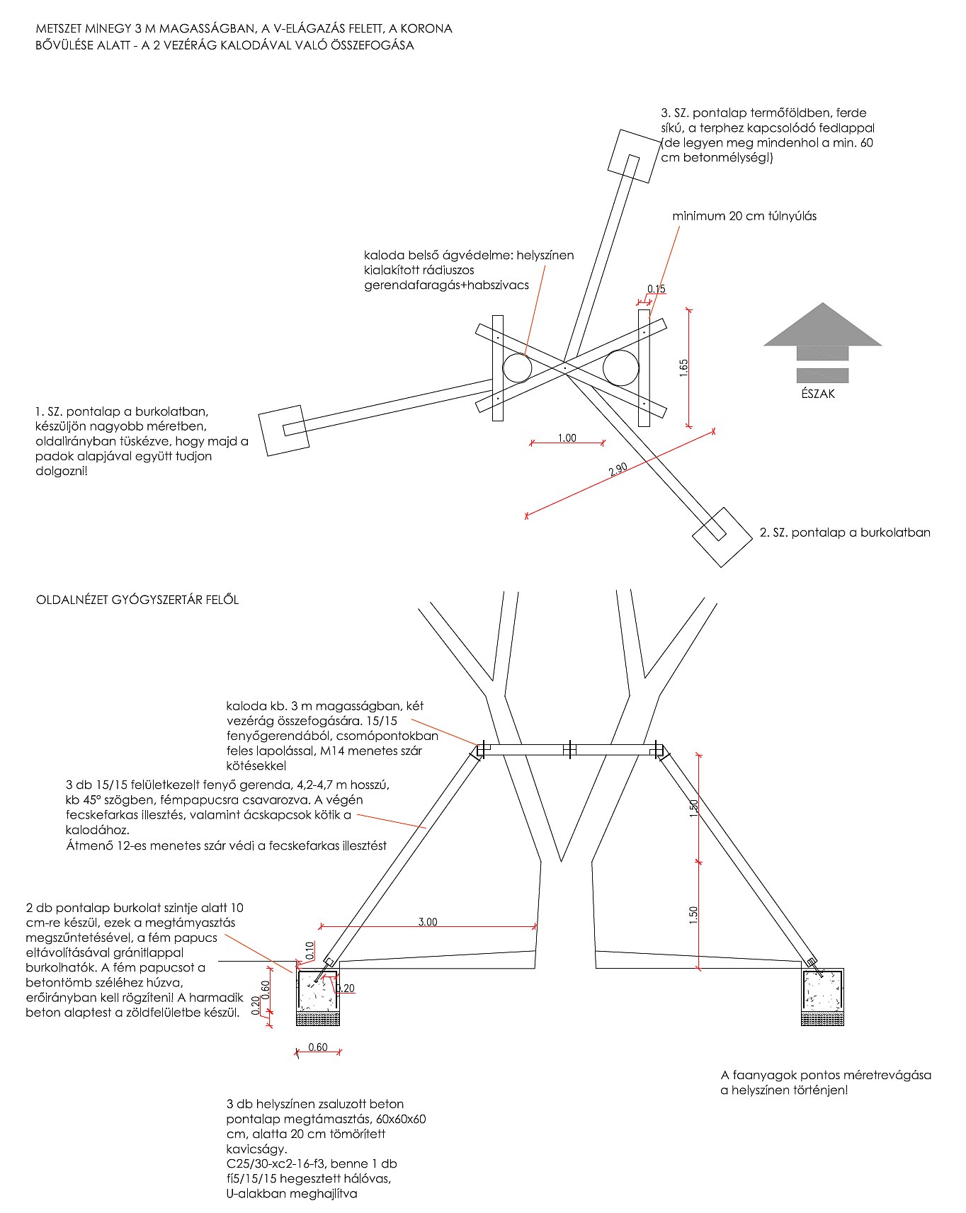 A megtámasztásra a DU-PLAN Mérnöki Iroda Kft. készítette el a statikai megerősítés tervét, mely szerint a V alakban elágazó törzset egy fenyőgerendákkal megtámasztott, vízszintes kalodaszerkezettel fogják át körülbelül három méterrel a felszín felett, a támoszlopokat körülbelül 45 fokos szögben beton pont alapba rögzítik egy fém tartószerkezethez.