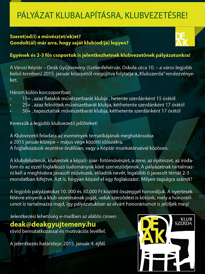 A Városi Képtár – Deák Gyűjtemény (Székesfehérvár, Oskola utca 10.) a város legjobb belső tereiben 2015. január közepétől megújítva folytatja a „Klubszerda” rendezvényeket három különböző korcsoportban. Ehhez kapcsolódóan keresik a legjobb klubvezető jelölteket, melyek közül a legjobb pályázatokat 10. 000 és 30.000 Ft közötti összeggel honorálják. A pályázat jelentkezési határideje 2015. január 4. éjfél.