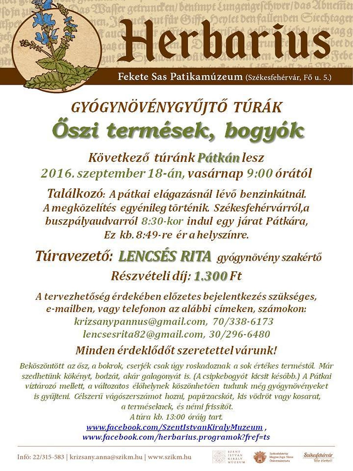 A találkozó vasárnap 9 órakor lesz a pátkai elágazásnál lévő benzinkútnál. A megközelítés egyénileg történik, a szervezők a Székesfehérvárról 8.30 órakor induló járatot javasolják. A résztvevőknek javasolt vágószerszámot és papírzacskót, kis vödröt, vagy kosarat hozni a terméseknek, valamint némi frissítőt a kirándulásra. A tervezhetőség érdekében előzetes bejelentkezés szükséges: a krizsanypannus@gmail.com, 70/338-6173, vagy a lencsesrita82@gmail.com, 30/296-6480 elérhetőségeken. További információk olvashatók a Szent István Király Múzeum és a Herbarius programok facebook oldalán.
