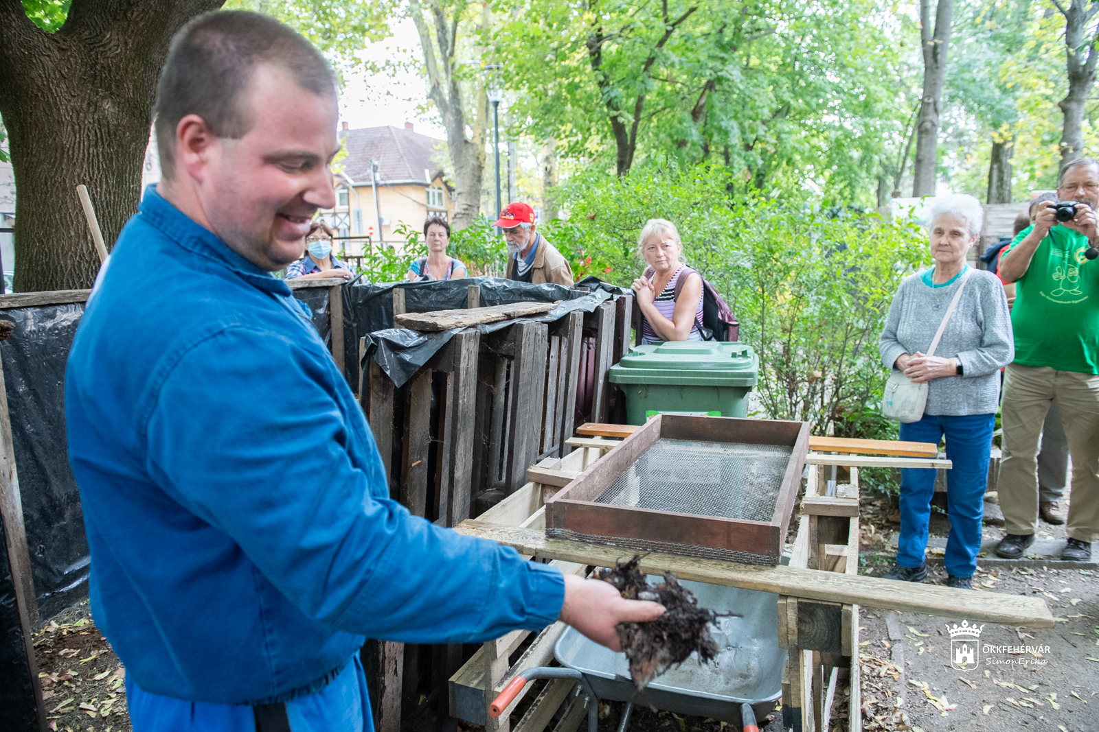 Az egyesület nevében Vajgerné Böhm Erika elnök és Gárdonyi László irodavezető fogadta az érkezőket, akiknek Traubert Attila tartott előadást a jó minőségű humusz készítésének mikéntjéről. A résztvevők megtudhatták például, hogy az ősszel lehullott avart érdemes egy fűnyíróval összeaprítani, ami jelentősen segíti a mikroorganizmusok munkáját, azaz a komposzt érését. Mivel ez a levélapríték magas széntartalmú, a sikeres komposztáláshoz nitrogénre is szükség van. Ezt zöldhulladékkal, például lenyírt fűvel biztosíthatjuk, de a konyhai hulladéknak is magas a nitrogéntartalma.