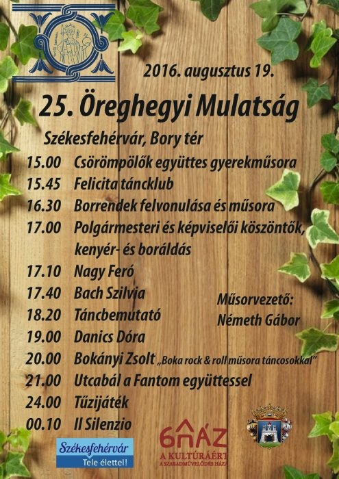 Az Öreghegyi Mulatság városrészi rendezvényként indult, az elmúlt évtizedekben azonban Székesfehérvár egyik legkedveltebb, egész napos programjává nőtte ki magát. Idén 25. alkalommal, hagyományosan a nemzeti ünnepet megelőző napon, augusztus 19-én kerül megrendezésre a mulatság, amely tartalmas kikapcsolódást, vidám időtöltést ígér minden korosztály számára. A délután folyamán fellép Nagy Feró és Bach Szilvia is, majd 21 órától a Fantom Együttessel lesz utcabál, éjfélkor pedig a hagyományos öreghegyi tűzijátékkal és az Il Silenzio-val ér véget a program.