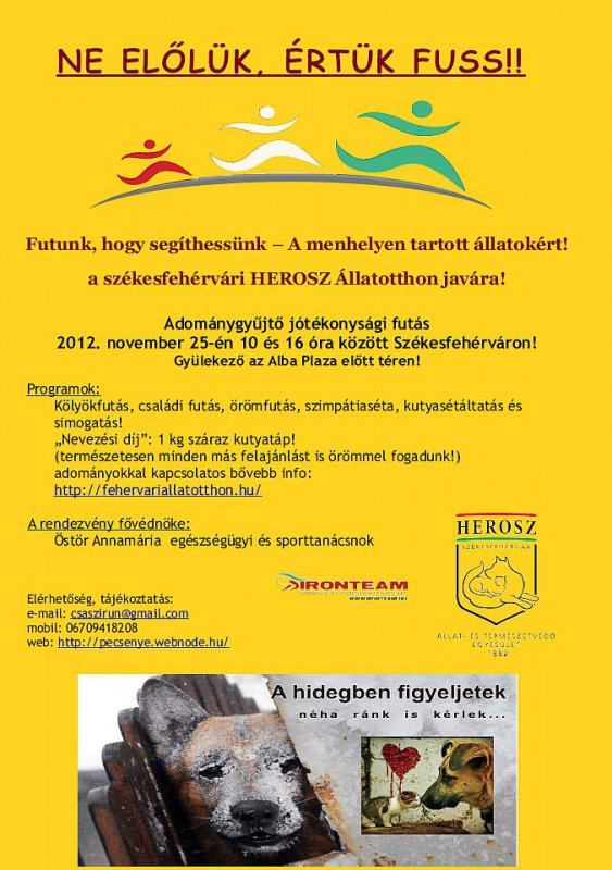 A „Ne előlük, értük fuss!” mottóval megrendezésre kerülő jótékonysági futás részleteiről Lajkó Csaba ultramaraton futó számolt be, aki kezdeményezője volt az akciónak. A gyülekező a Plaza előtti téren lesz délelőtt 10.00 órakor, nevezni egy kilogramm cica- vagy kutyatáppal, illetve bármilyen adománnyal lehet. Az ismert sportember és barátai a Mátyás király körút-Ady E. u-Jókai u. - Liszt F. utca útvonalon futnak, vagy sétálnak 16.00 óráig több alkalommal és bárki csatlakozhat hozzájuk kedve szerint. Lajkó Csaba elmondta: a széleskörű felhívásnak köszönhetően jönnek szimpatizánsok Budapestről, Bajáról, Szekszárdról és Kalocsáról, így a kezdeményezés országos akcióvá válik. A befolyó adományokat teljes egészében a székesfehérvári Herosz Állatotthon kapja.