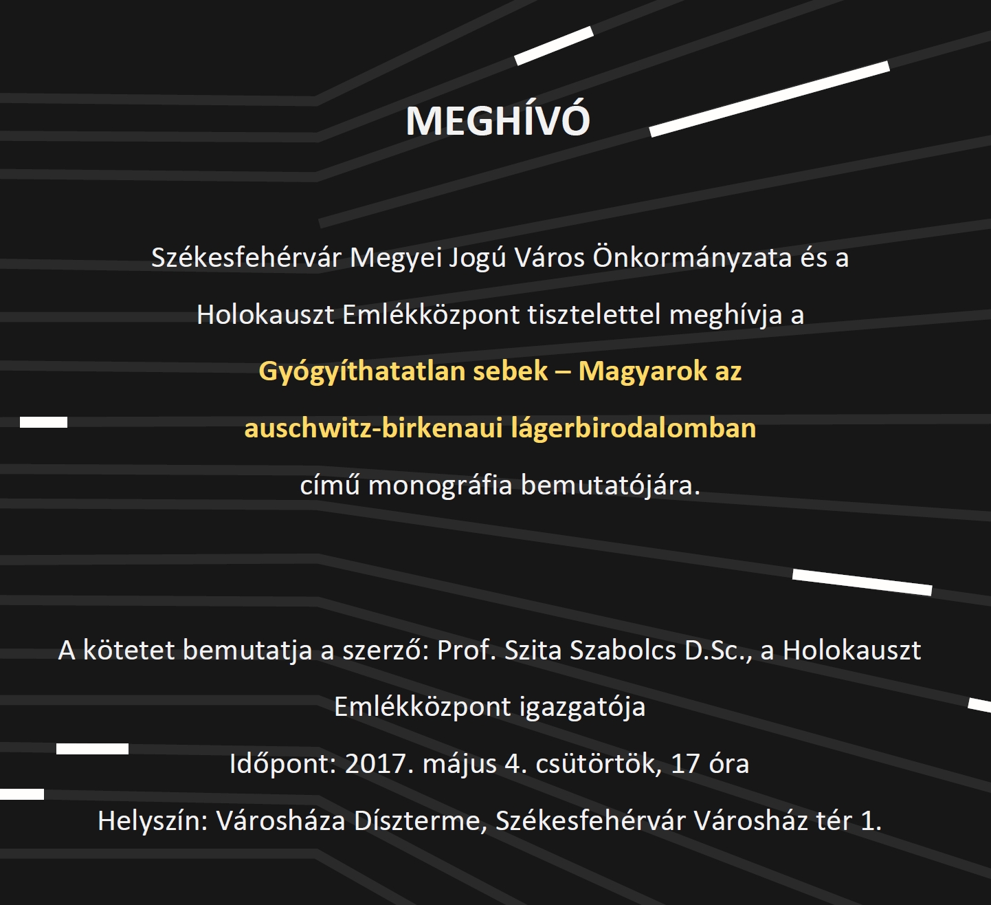 Magyarok az auschwitz-birkenaui lágerbirodalomban címmel megjelent könyvét május 4-én mutatja be a fehérváriaknak a szerző, Prof. Szita Szabolcs D.Sc.. A Holokauszt Emlékközpont igazgatójának monográfiája a koncentrációs tábor kiépítéséről és az oda való deportálásokról szól, melyben arról is beszél, hogy ki és mit tudhatott ezen gyalázatról. A kötetbemutatóra a Városházán kerül sor, ahol dr. Cser-Palkovics András mond köszöntőt.