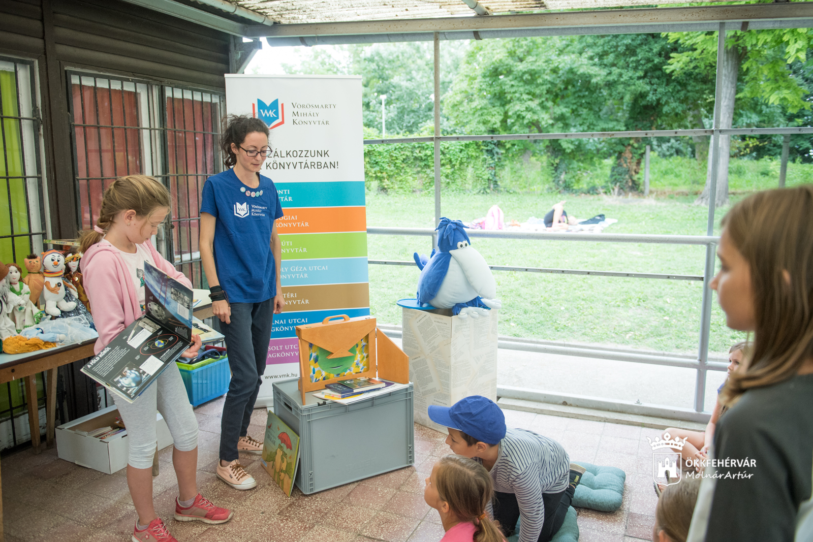 Gombóc Artúrral és remek olvasnivalókkal, bábokkal érkeztek ki ma délelőtt a VMK könyvtárosai a Napraforgó táborba. A napközis iskolásoknak érzékenyítő programot tartottak papírszínházzal, zsákbamacskával, bábos játékkal, jógával és sok-sok könyvvel. A szomszéd asztaloknál kézműveskedés folyt, a fák alatt pedig kisálatokkal ismerkedhettek a gyerekek.