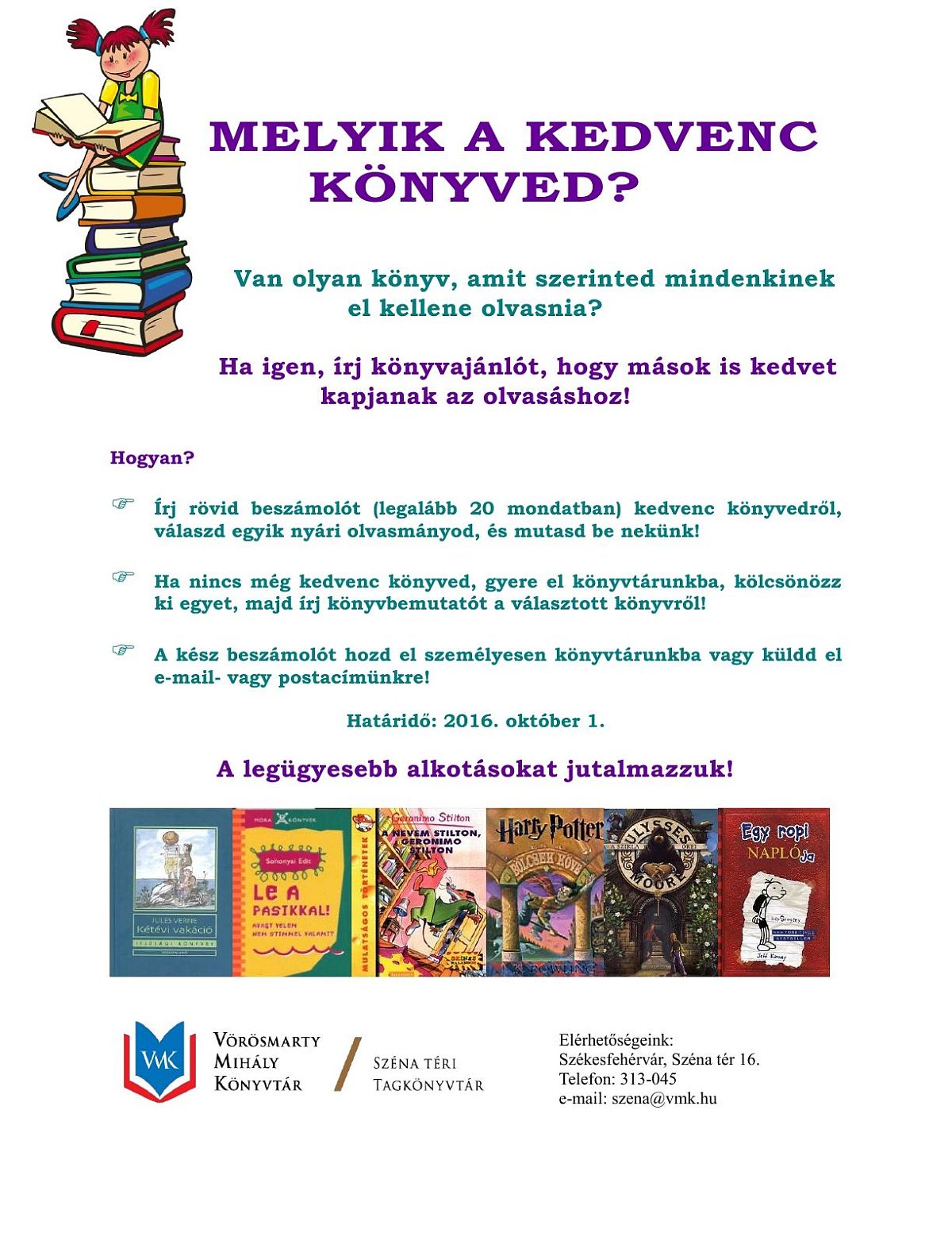 Harmadik alkalommal hirdette meg a „Melyik a kedvenc könyved?” című pályázatát aVörösmarty Mihály Könyvtár Széna téri Tagkönyvtára. A pályázaton általános és középiskolások, de akár felsőfokú tanulmányokat végzők is részt vehetnek. A jelentkezőknek rövid, frappáns beszámolót kell készíteniük kedvenc könyvükről, vagy nyári olvasmányukról, így ajánlva azt másoknak is.
