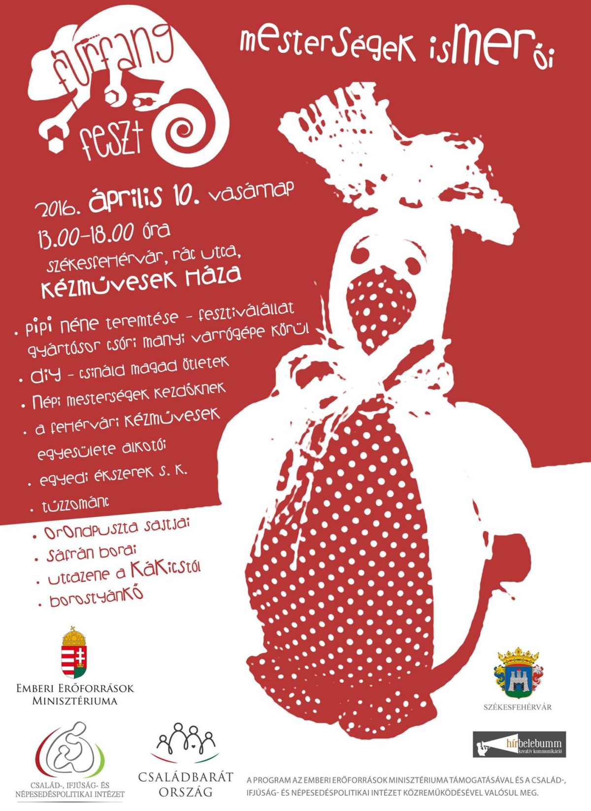 Az eseményt felvezető sajtótájékoztatón a Kézművesek Házában Szenczi Jánosné, a Fehérvári Kézművesek Egyesülete elnöke, Viza Attila, Székesfehérvár 8. számú választókörzetének önkormányzati képviselője, Tóth György Szilveszter, a Borostyánkő Hagyományőrző Egyesület tagja és Majer Tamás, a szervező HírBeleBumm Kreatív Kommunikáció munkatársa beszélt a vasárnapi rendezvényről.Az eseményen résztvevőket színes programkínálat várja: fesztiválállat-varrás Csóri Manyival, egyedi könyvjelzők kivitelezése Tóth Eszterrel, a Basa utca dizájnerével, bútorrestauráló workshop, pánsípkészítés a Los Andinos muzsikusaival, tűzzománc ékszerek közös megmunkálása 850 Celsius-fokon Fenyvesi Attilával, valamint környezetbarát kukahangszerek „riszájkling” előállítása gyerekeknek az Ars Musica Zenebarátok Egyesülete legkreatívabb tagjaival. 16.45 órától a Kákics együttes zenél, műsoruk közben népmesét mond Baboth Dóra néprajzkutató.