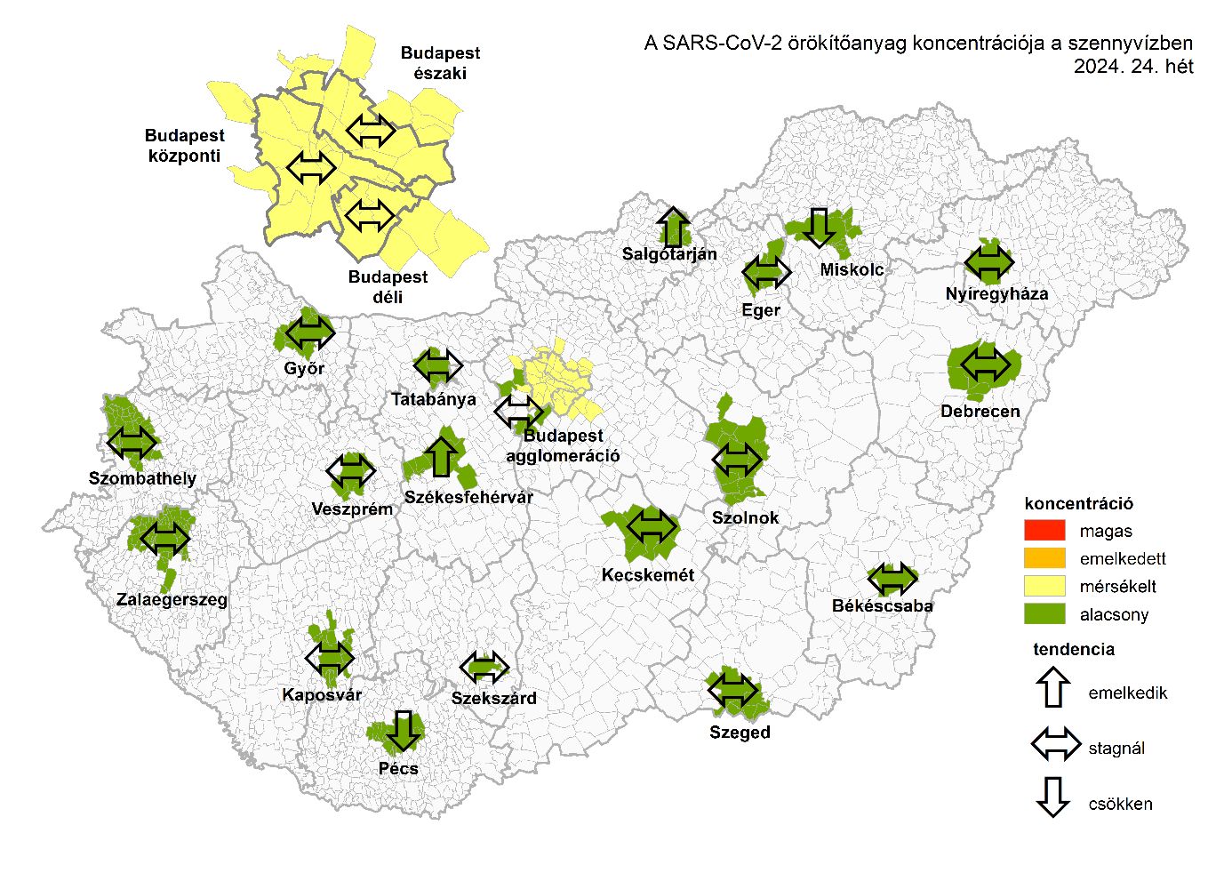 Országos átlagot tekintve tovább folytatódott a szennyvízben mért SARS-CoV-2 örökítőanyag koncentráció-csökkenése. A vizsgált városok többségét stagnáló tendencia jellemzi, ezt mérték Székesfehérváron is emelkedett koncentráció mellett.