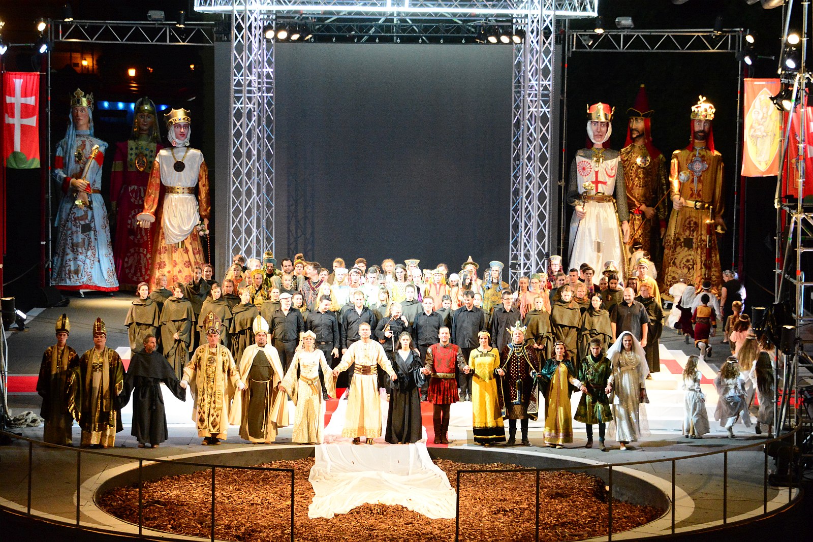 Az egykori koronázótemplom helyén bemutatandó darabnak ezúttal is szereplői a történelmi óriásbábok, statisztaként pedig határon túli gyerekek is bekapcsolódnak az előadásba. A közönség részese lehet annak a királyi felvonulásnak is, amely a koronázótemplomba tart: II. András és felesége, Gertrúd az udvartartás kíséretében vonulnak a bazilikába, majd kezdetét veszi a színdarab. Az előadást szombaton és vasárnap is láthatja a közönség a székesfehérvári Nemzeti Emlékhelyen.