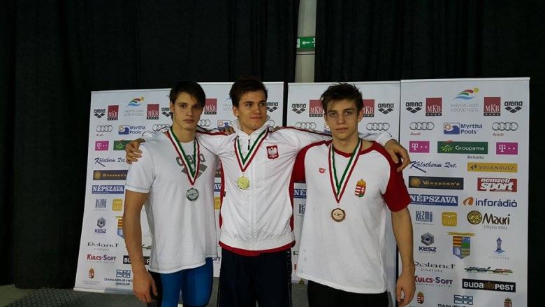 Fekete Ferenc (jobbra) az 50 méteres gyorsúszás döntőjében győztes lengyel Ostrowski (0:23,44) és román Radu (0:23,57) társaságában az eredményhiretés után Hódmezővásárhelyen.