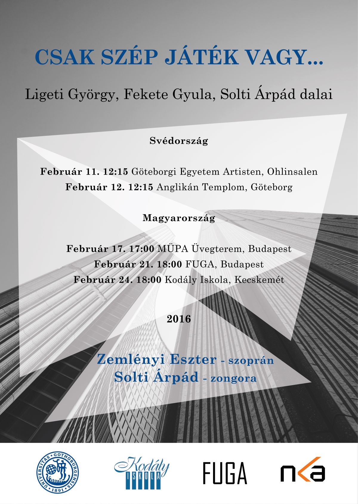 2016. február 11 -24. között Svédországban és Magyar- országon 5 alkalommal csendülnek fel Ligeti György, Fekete Gyula és Solti Árpád különleges atmoszférájú, egyedi hangulatú dalai. Ezeken a koncerteken két elkötelezett fiatal zenésszel, köztük Zemlényi Eszter fiatal székesfehérvári énekművésszel ismerkedhet meg a hallgatóság.
