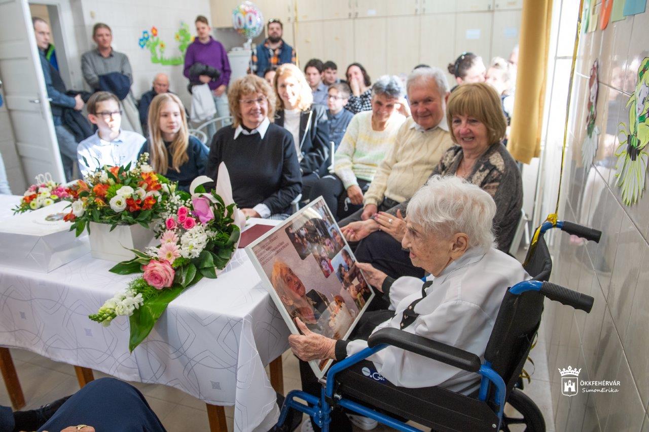 A jeles 100. születésnap tiszteletére családtagok sokasága, barátok, ismerősök és az otthon dolgozói gyűltek össze az intézmény ebédlőjében.