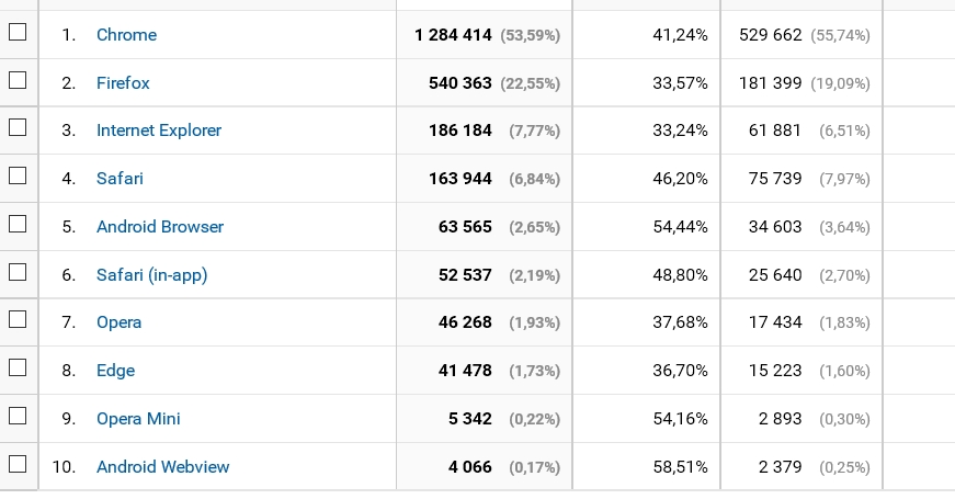Érdekesen alakul a böngészők használata: még az évtized elején éppen a harmadik helyen kullogottt a Chrome és Explorert illetve Firefoxot használtak a legtöbben mára teljesen megváltozott. Egyre kevesebben használnak Firefox és Explorer böngészőt, a legtöbben Chrome-mal néznek minket: idén összesen 1.284.414 felhasználó. Érdekes adat a telefonokról érkező látogatásokat nézve, hogy a lista első helyén az iPhone áll, azonban a lista 2. és 15. helye között jórészt Samsung telefonok valamelyike található, de az ötödik helyre beküzdötte magát a Huawei ALE-L21 P8 Lite is.