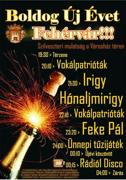 Este fél nyolckor térzenével kezdődik a szilveszteri mulatság a Városház Téren. Az est folyamán fellépnek a Vokálpatrióták, fél tízkor ad koncertet az Irigy Hónaljmirigy, tizeneggy után húsz perccel pedig Feke Pál lép a színpadra. Éjfélkor ünnepi tűzijáték is lesz a belvárosban, majd a város polgármestere Warvasovszky Tihamér és Vargha Tamás tanácsnok mond újévi köszöntőt. A program ingyenes, mindenkit szeretettel várnak! A téren a büfék is nyitva tartanak.