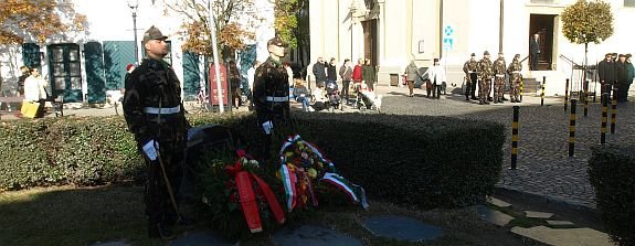Koszorúz: Égi Tamás alpolgármester; a Fejér Megyei Közgyűlés képviselője és Bárány Zoltán ezredes az Összhaderőnemi Parancsnokságról. Közreműködik a Székesfehérvári Helyőrségi Zenekar