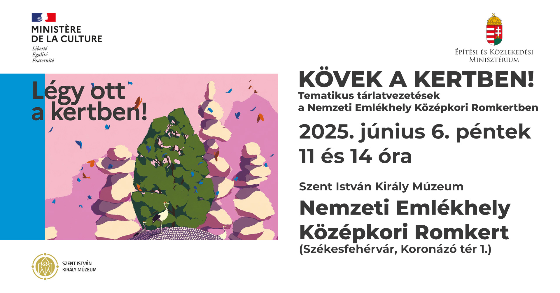 A középkori Romkert egykori és mai kertépítészeti megoldásairól szól Kovács Dóra múzeumpedagógus tematikus tárlatvezetése 14 órától. Mint ismert, a székesfehérvári Középkori Romkert a Szent István király által alapított koronázótemplom romjait őrzi. Mai formáját a 2000-es évek elején nyerte el, de addig többszöri átalakítást élt meg, amelyeket a maradványok érthető bemutatását célzó kertépítészeti megoldások is tarkítottak. A koronázóbazilika története mellett ezekről hallhatnak érdekességeket a résztvevők.