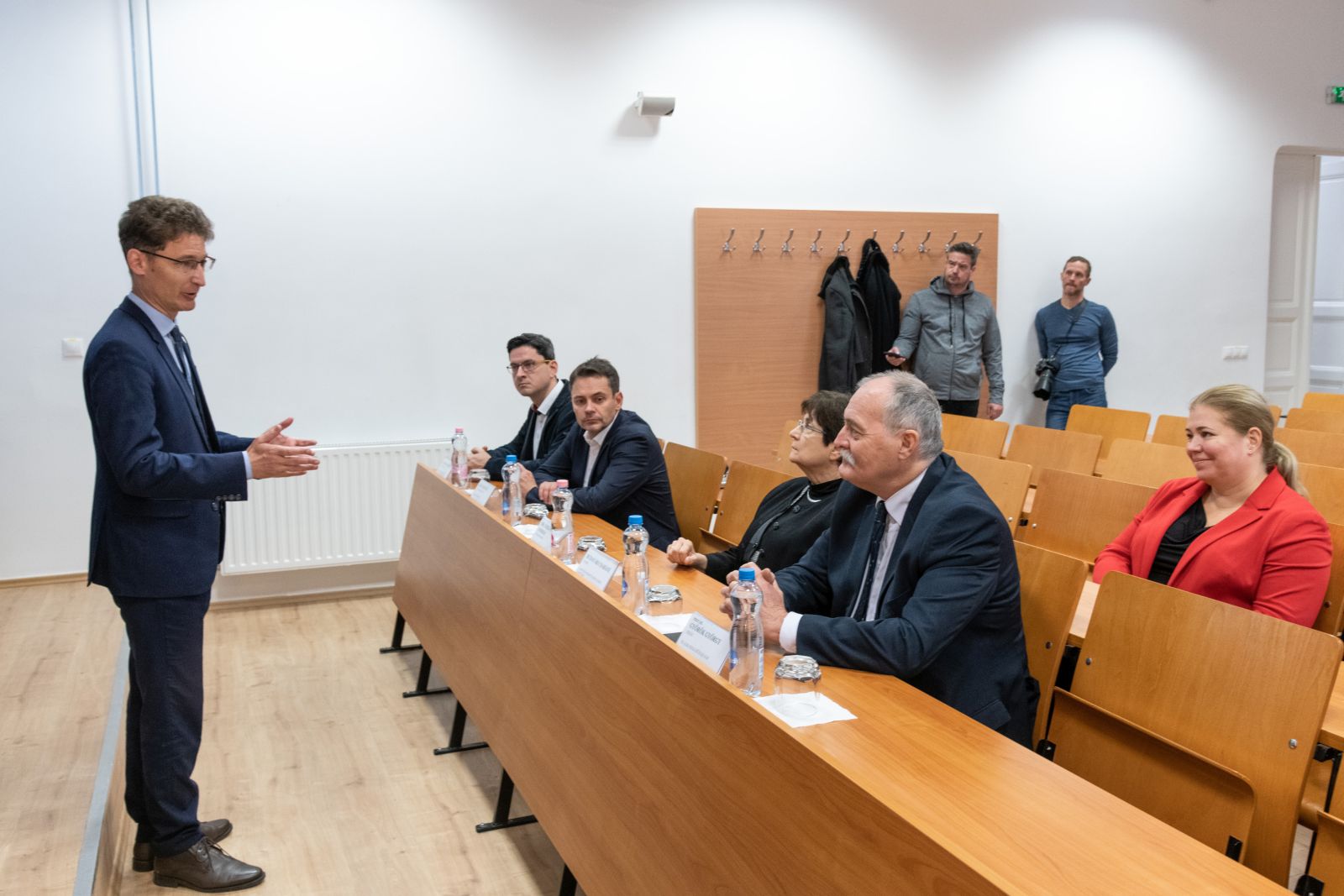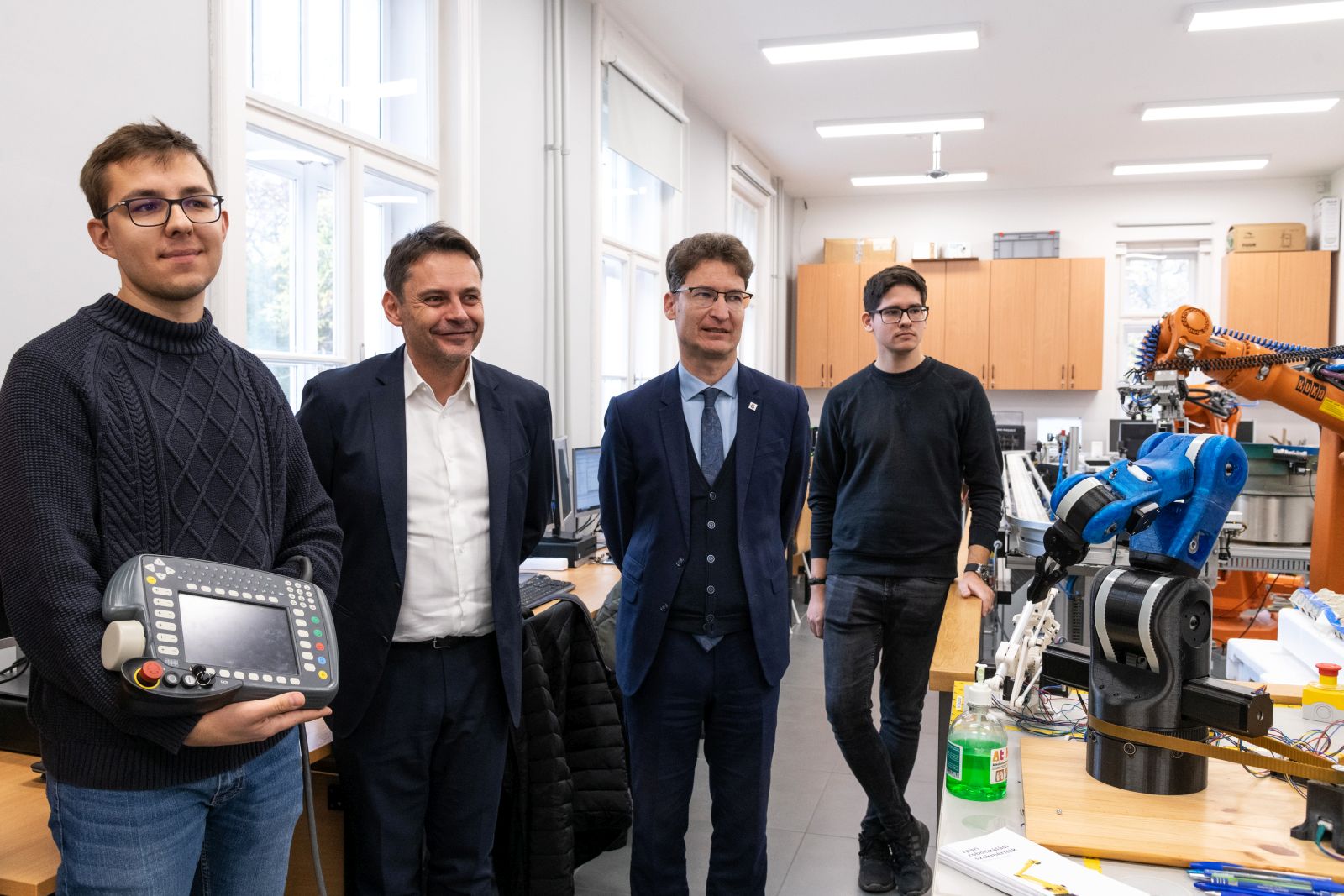 Dr. Széll Károly docens rövid előadásában bemutatta azokat a laborokat, amik az utóbbi években létrejöttek: a robottechnikai központot, a VR labort és a pneumatikai labort. A megkezdett munkának már komoly eredményei is vannak, a hallgatók megnyerték többek között a tavalyi FANUC Olimpiát is, ahol a versenyzőknek egy komplex feladatot kellett megvalósítaniuk kilenc órás időkeretben. A versenyen az első két helyezést is sikerült az Óbudai Egyetem Alba Regia Műszaki Kar csapatainak elhoznia. A docens szólt arról is, hogy a kutatásban és a fejlesztésben is nagy hasznát veszik a partnerektől érkező támogatásoknak.