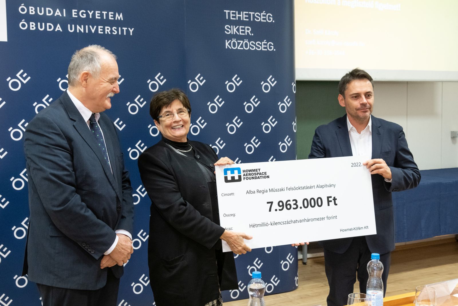 Katus István, a Howmet-Köfém Kft. ügyvezető igazgatója beszédében felidézte, hogy 2016 óta minden évben eljönnek egy csekkel az Óbudai Egyetemre, és ez már a hetedik alkalom, így összességében közel 150 millió forintot adtak azokra a projektekre, amik hozzásegítik a vállalatot ahhoz, hogy olyan szakemberek kerüljenek ki az egyetem falai közül. akiket egyből tudnak alkalmazni. Hozzátette, hogy a gyakorlati tudás erősítése a cél és továbbra is várja a cég a tehetséges végzősöket. Katus István arra kérte az egyetemet, hogy jövőre is keressék meg a vállalatot olyan projektekkel, amelyeket támogatni tudnak az alapítványon keresztül.