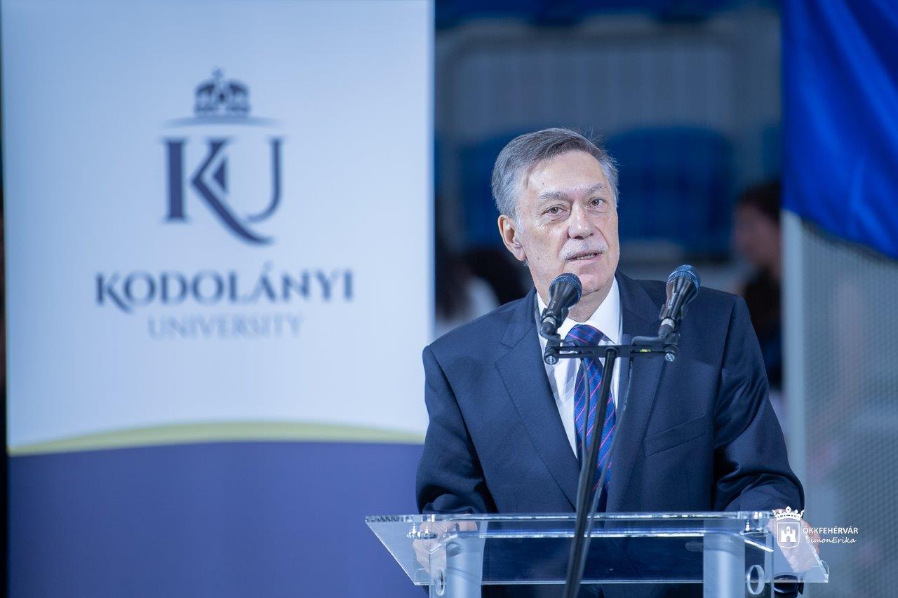 Dr. Vizi László Tamás mb. rektor ünnepi beszédében kiemelte: az, hogy ma itt vagyunk Székesfehérváron, az Alba Arénában, jelkép és bizonyítás is. A Kodolányi János Egyetem és a nemzet történelmi fővárosának, a nagy múlt Alba Regiának, Székesfehérvárnak a neve összefonódott egymással, mert a város magáénak érzi az egyetemet. Intézményünk elkötelezett abban, hogy aktívan részt vegyen Székesfehérvár és a régió kulturális és gazdasági életében, hozzájáruljon a város fejlődéséhez. A végzősökhöz szólva elmondta, az egyetemen töltött képzési időszakban olyan versenyképes, értékőrző, gyakorlati tudást szereztek, amellyel megállják helyüket a munka világában. Emlékeztetett ugyanakkor: arra minden időben figyelni kell, hogy ezt a tudást frissítsék, napra készek legyenek szakterületükön. A friss diplomásoknak Ady Endre gondolataival kívánt sikeres, boldog életet a rektor.